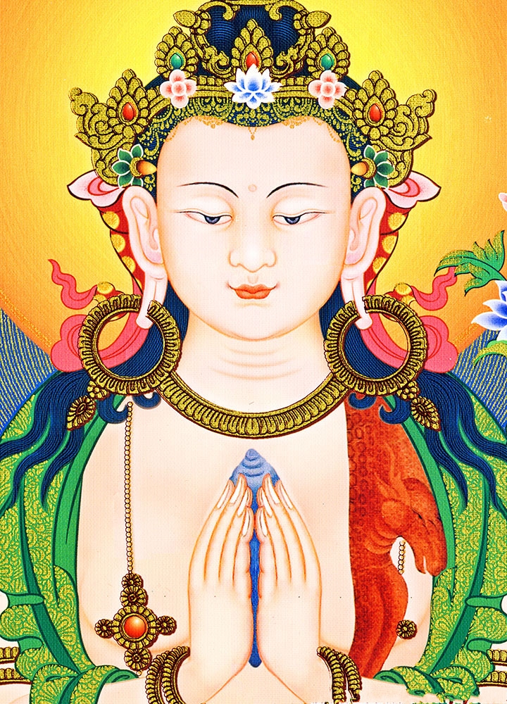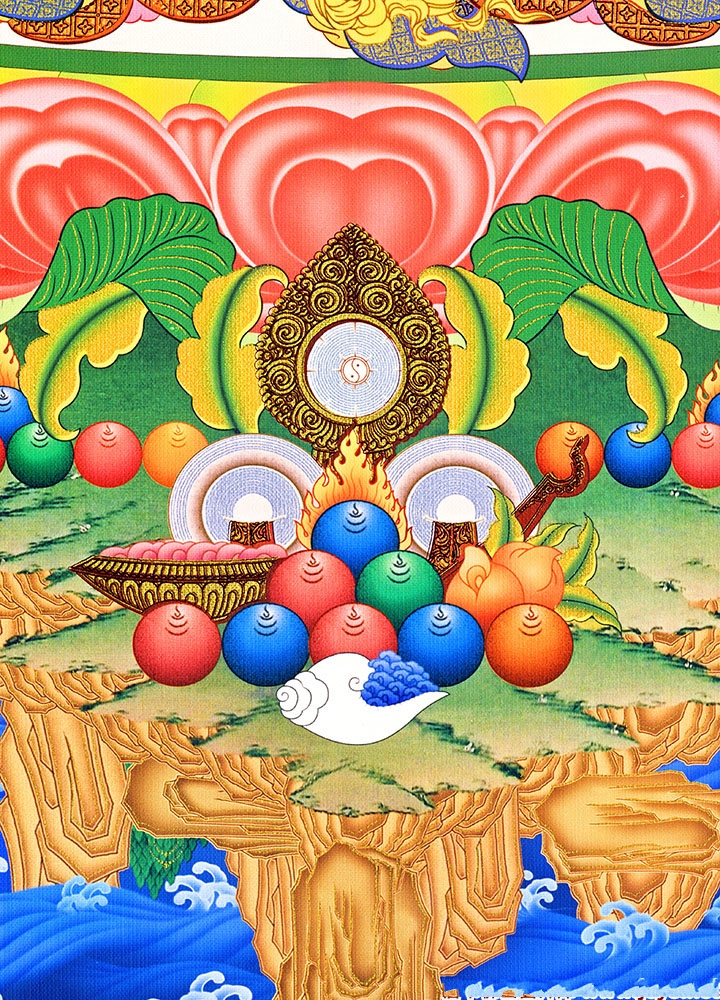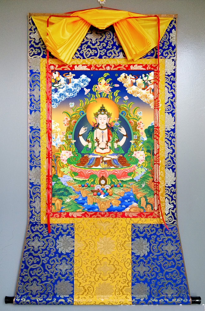 因是佛教圣相,所以我們選用的裝裱材料均是現在能有的最好的裝裱材料,正面選用定制的高檔棉織金絲錦緞很多仿制的是化纖材料,織繡藏傳佛教的富貴蓮花圖案,背面使用加厚仿真絲黃色綢緞布,手工精細裝裱而成,帶掛軸,照面,可直接懸掛到墻上。