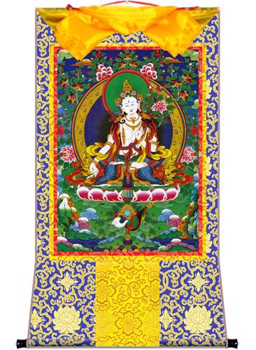 因是佛教圣相,所以我們選用的裝裱材料均是現在能有的最好的裝裱材料,正面選用定制的高檔棉織金絲錦緞很多仿制的是化纖材料,織繡藏傳佛教的富貴蓮花圖案,背面使用加厚仿真絲黃色綢緞布,手工精細裝裱而成,帶掛軸,照面,可直接懸掛到墻上。