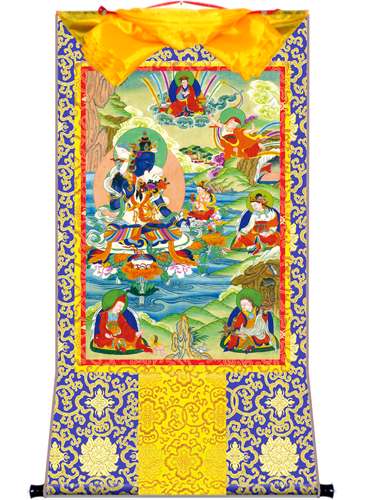 因是佛教圣相,所以我們選用的裝裱材料均是現在能有的最好的裝裱材料,正面選用定制的高檔棉織金絲錦緞很多仿制的是化纖材料,織繡藏傳佛教的富貴蓮花圖案,背面使用加厚仿真絲黃色綢緞布,手工精細裝裱而成,帶掛軸,照面,可直接懸掛到墻上。