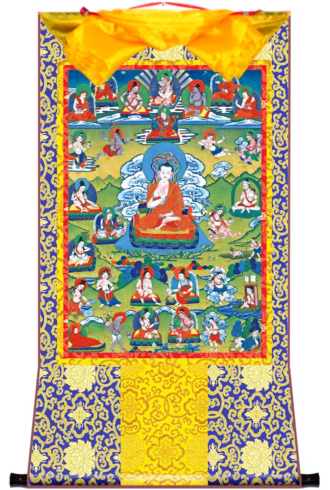 因是佛教圣相,所以我們選用的裝裱材料均是現在能有的最好的裝裱材料,正面選用定制的高檔棉織金絲錦緞很多仿制的是化纖材料,織繡藏傳佛教的富貴蓮花圖案,背面使用加厚仿真絲黃色綢緞布,手工精細裝裱而成,帶掛軸,照面,可直接懸掛到墻上。