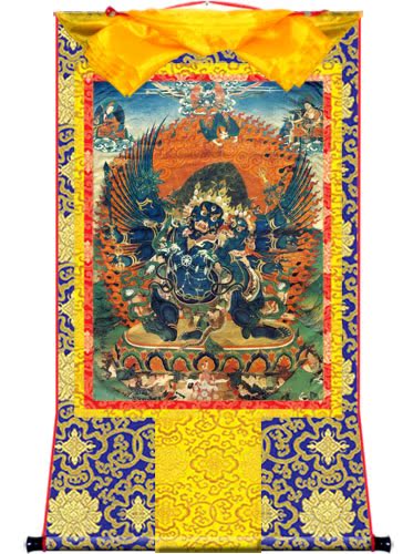 因是佛教圣相,所以我們選用的裝裱材料均是現在能有的最好的裝裱材料,正面選用定制的高檔棉織金絲錦緞很多仿制的是化纖材料,織繡藏傳佛教的富貴蓮花圖案,背面使用加厚仿真絲黃色綢緞布,手工精細裝裱而成,帶掛軸,照面,可直接懸掛到墻上。