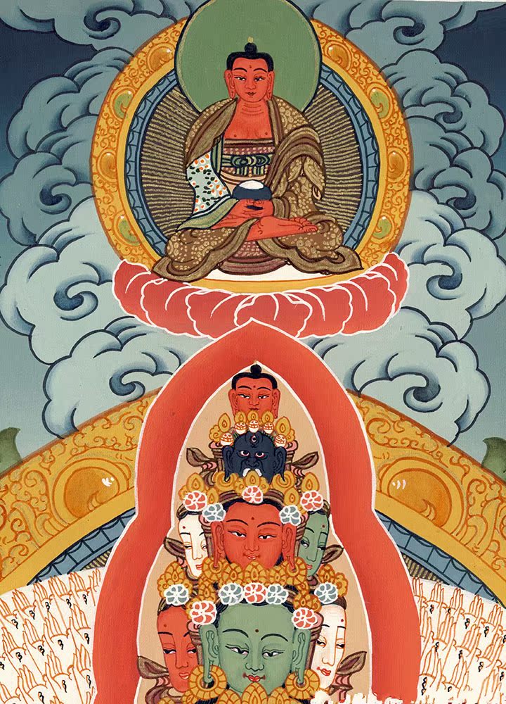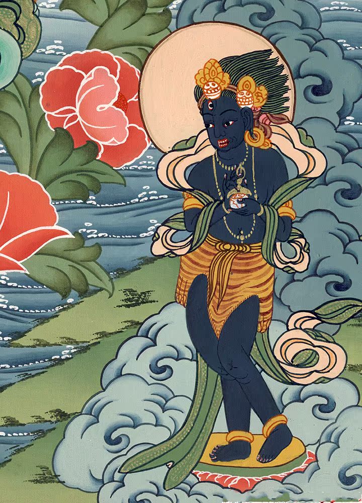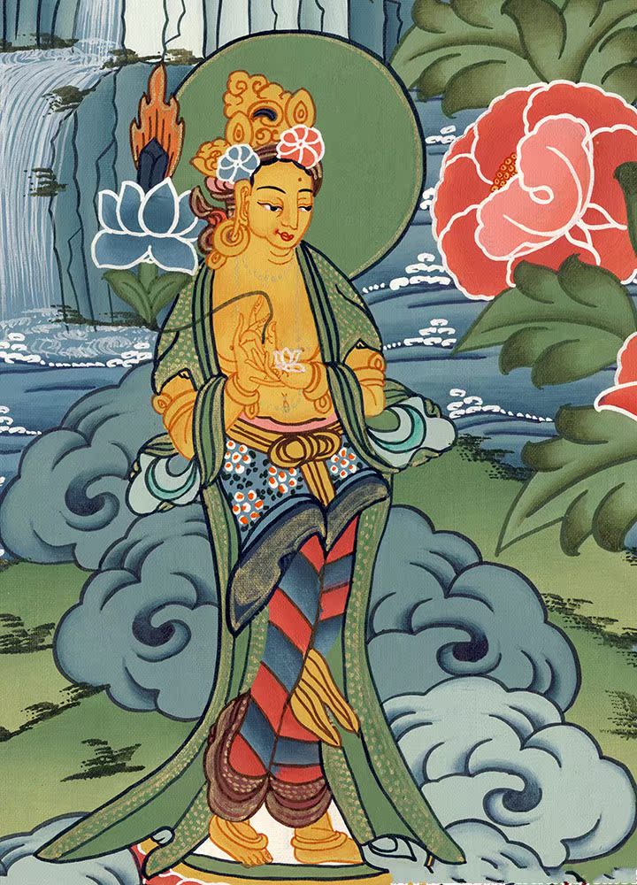 因是佛教圣相,所以我們選用的裝裱材料均是現在能有的最好的裝裱材料,正面選用定制的高檔棉織金絲錦緞很多仿制的是化纖材料,織繡藏傳佛教的富貴蓮花圖案,背面使用加厚仿真絲黃色綢緞布,手工精細裝裱而成,帶掛軸,照面,可直接懸掛到墻上。
