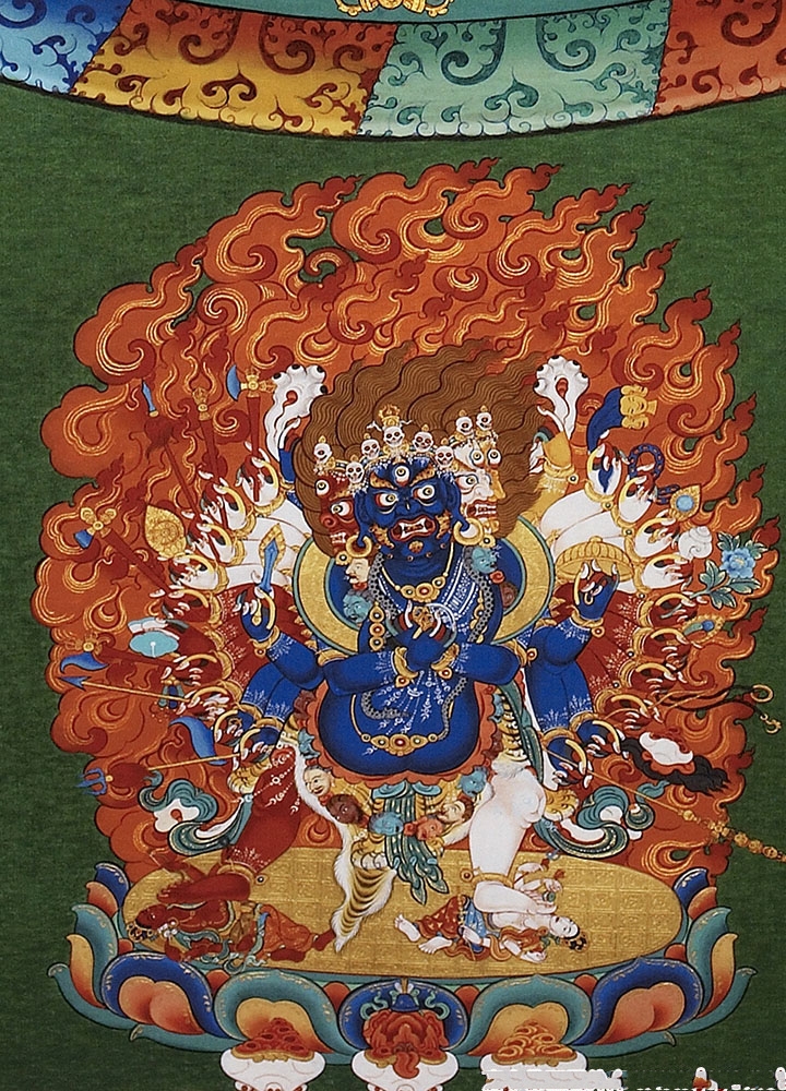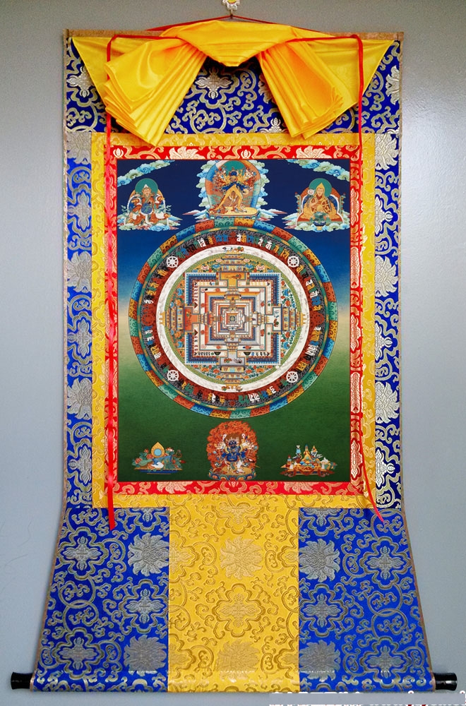 因是佛教圣相,所以我們選用的裝裱材料均是現在能有的最好的裝裱材料,正面選用定制的高檔棉織金絲錦緞很多仿制的是化纖材料,織繡藏傳佛教的富貴蓮花圖案,背面使用加厚仿真絲黃色綢緞布,手工精細裝裱而成,帶掛軸,照面,可直接懸掛到墻上。