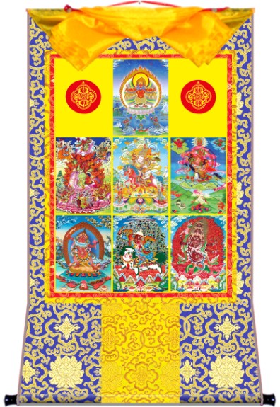 因是佛教圣相,所以我們選用的裝裱材料均是現在能有的最好的裝裱材料,正面選用定制的高檔棉織金絲錦緞很多仿制的是化纖材料,織繡藏傳佛教的富貴蓮花圖案,背面使用加厚仿真絲黃色綢緞布,手工精細裝裱而成,帶掛軸,照面,可直接懸掛到墻上。