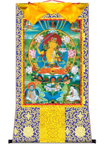 因是佛教圣相,所以我們選用的裝裱材料均是現在能有的最好的裝裱材料,正面選用定制的高檔棉織金絲錦緞很多仿制的是化纖材料,織繡藏傳佛教的富貴蓮花圖案,背面使用加厚仿真絲黃色綢緞布,手工精細裝裱而成,帶掛軸,照面,可直接懸掛到墻上。