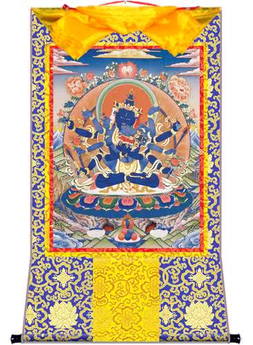 因是佛教圣相,所以我們選用的裝裱材料均是現在能有的最好的裝裱材料,正面選用定制的高檔棉織金絲錦緞很多仿制的是化纖材料,織繡藏傳佛教的富貴蓮花圖案,背面使用加厚仿真絲黃色綢緞布,手工精細裝裱而成,帶掛軸,照面,可直接懸掛到墻上。