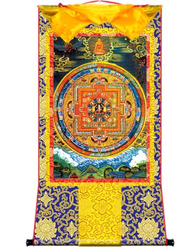 因是佛教圣相,所以我們選用的裝裱材料均是現在能有的最好的裝裱材料,正面選用定制的高檔棉織金絲錦緞很多仿制的是化纖材料,織繡藏傳佛教的富貴蓮花圖案,背面使用加厚仿真絲黃色綢緞布,手工精細裝裱而成,帶掛軸,照面,可直接懸掛到墻上。