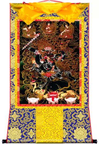 因是佛教圣相,所以我們選用的裝裱材料均是現在能有的最好的裝裱材料,正面選用定制的高檔棉織金絲錦緞很多仿制的是化纖材料,織繡藏傳佛教的富貴蓮花圖案,背面使用加厚仿真絲黃色綢緞布,手工精細裝裱而成,帶掛軸,照面,可直接懸掛到墻上。