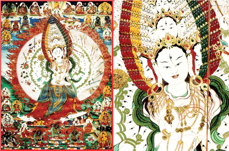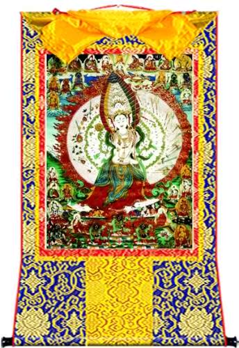 因是佛教圣相,所以我們選用的裝裱材料均是現在能有的最好的裝裱材料,正面選用定制的高檔棉織金絲錦緞很多仿制的是化纖材料,織繡藏傳佛教的富貴蓮花圖案,背面使用加厚仿真絲黃色綢緞布,手工精細裝裱而成,帶掛軸,照面,可直接懸掛到墻上。