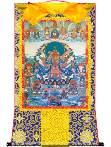 因是佛教圣相,所以我們選用的裝裱材料均是現在能有的最好的裝裱材料,正面選用定制的高檔棉織金絲錦緞很多仿制的是化纖材料,織繡藏傳佛教的富貴蓮花圖案,背面使用加厚仿真絲黃色綢緞布,手工精細裝裱而成,帶掛軸,照面,可直接懸掛到墻上。