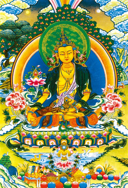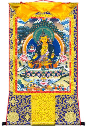 因是佛教圣相,所以我們選用的裝裱材料均是現在能有的最好的裝裱材料,正面選用定制的高檔棉織金絲錦緞很多仿制的是化纖材料,織繡藏傳佛教的富貴蓮花圖案,背面使用加厚仿真絲黃色綢緞布,手工精細裝裱而成,帶掛軸,照面,可直接懸掛到墻上。