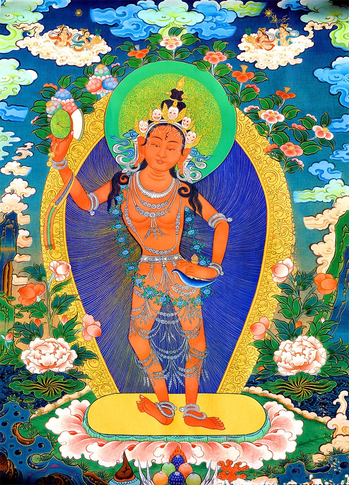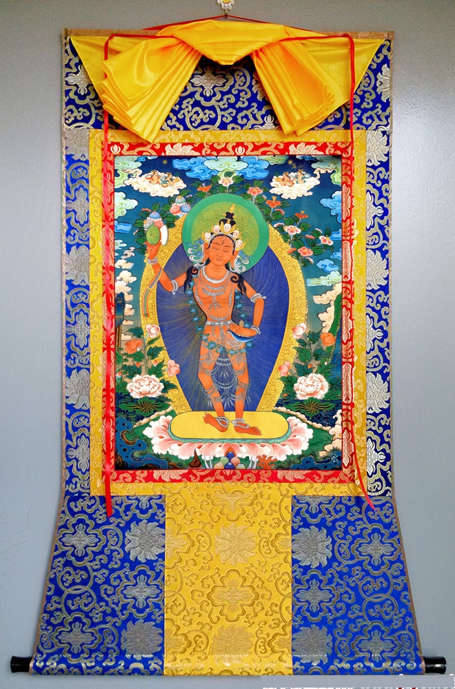 因是佛教圣相,所以我們選用的裝裱材料均是現在能有的最好的裝裱材料,正面選用定制的高檔棉織金絲錦緞很多仿制的是化纖材料,織繡藏傳佛教的富貴蓮花圖案,背面使用加厚仿真絲黃色綢緞布,手工精細裝裱而成,帶掛軸,照面,可直接懸掛到墻上。
