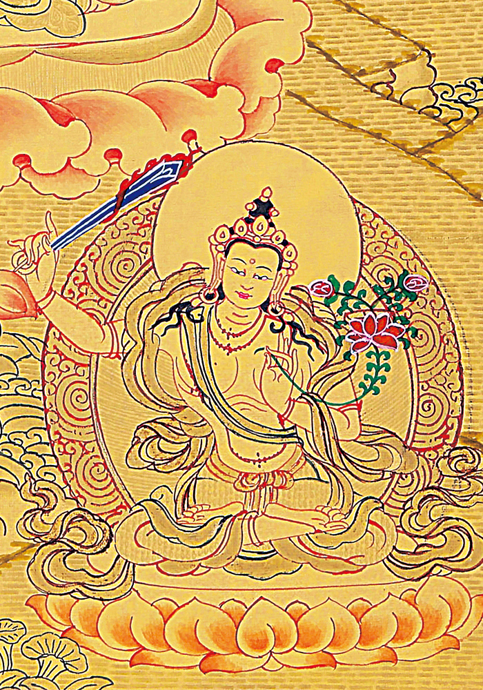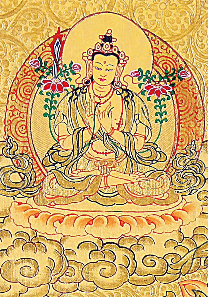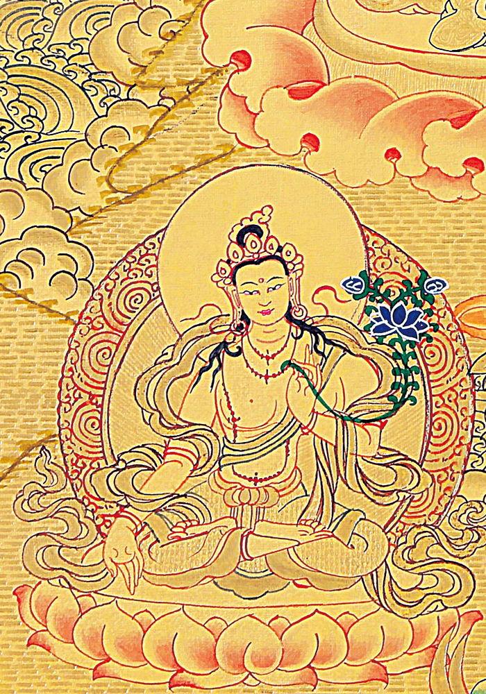 因是佛教圣相,所以我們選用的裝裱材料均是現在能有的最好的裝裱材料,正面選用定制的高檔棉織金絲錦緞很多仿制的是化纖材料,織繡藏傳佛教的富貴蓮花圖案,背面使用加厚仿真絲黃色綢緞布,手工精細裝裱而成,帶掛軸,照面,可直接懸掛到墻上。 <