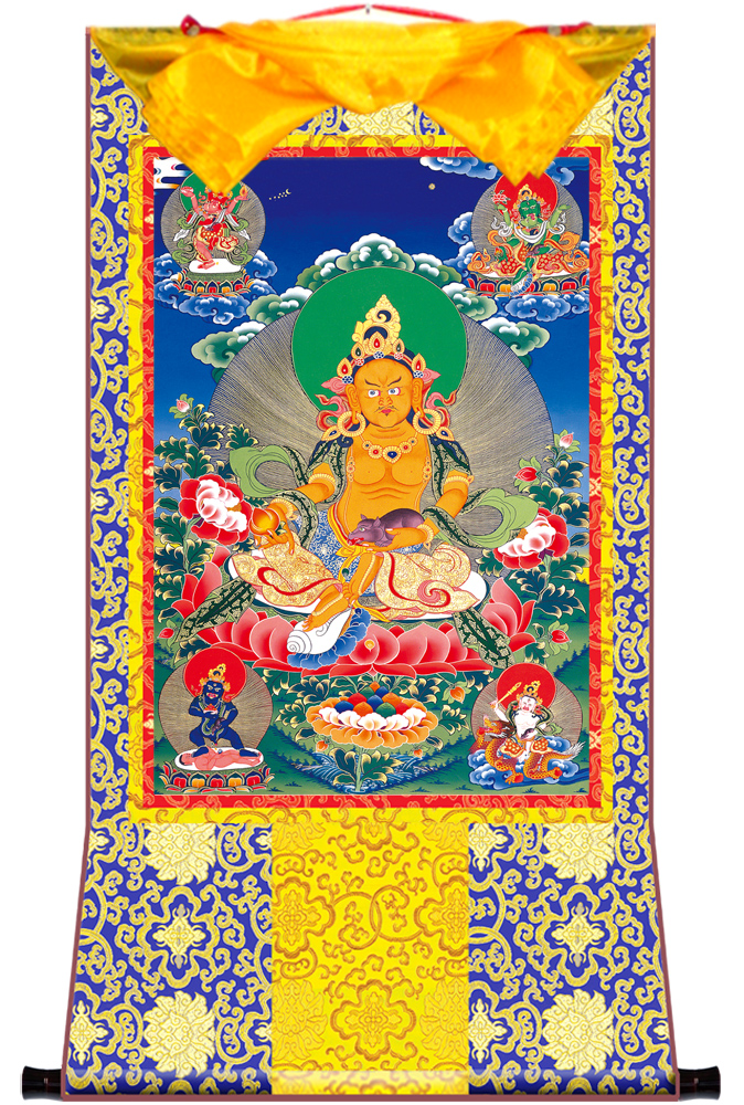 因是佛教圣相,所以我們選用的裝裱材料均是現在能有的最好的裝裱材料,正面選用定制的高檔棉織金絲錦緞很多仿制的是化纖材料,織繡藏傳佛教的富貴蓮花圖案,背面使用加厚仿真絲黃色綢緞布,手工精細裝裱而成,帶掛軸,照面,可直接懸掛到墻上。
