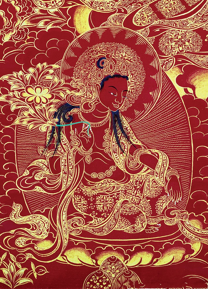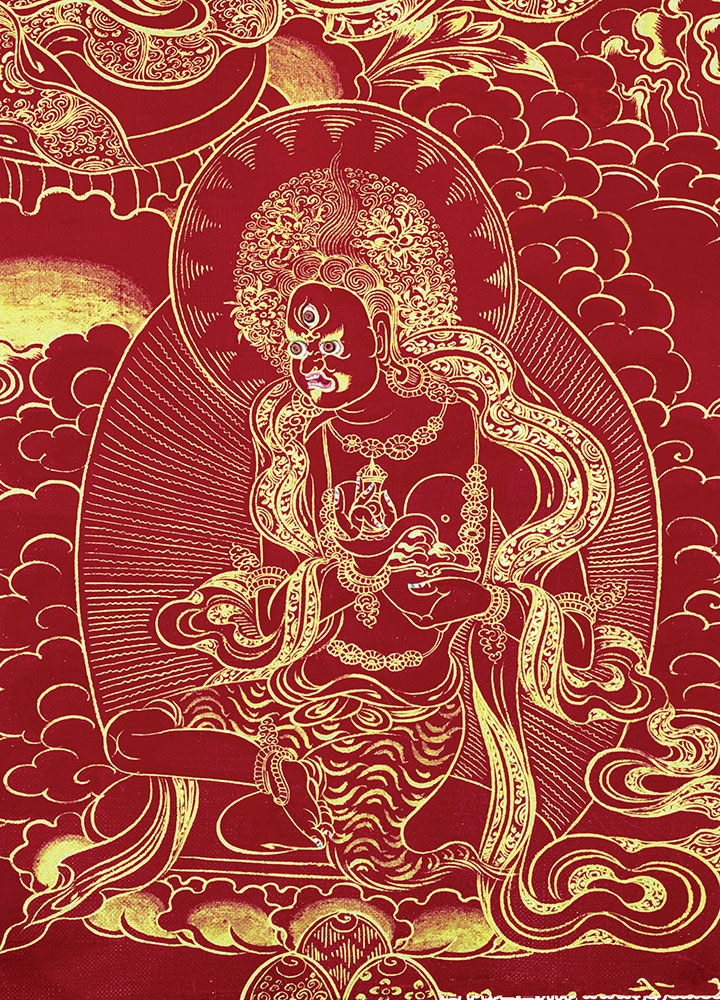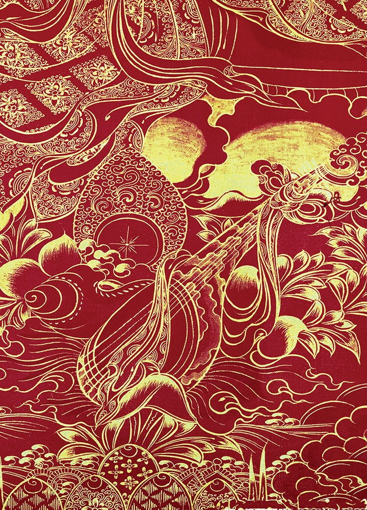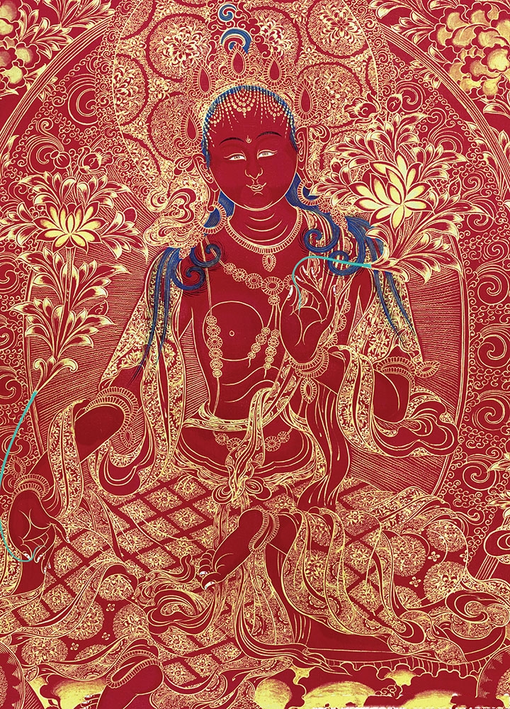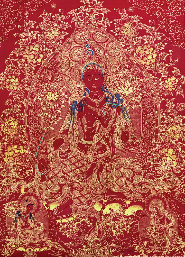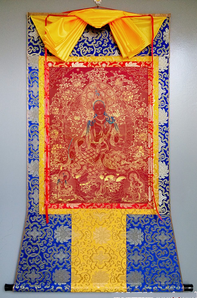 因是佛教圣相,所以我們選用的裝裱材料均是現在能有的最好的裝裱材料,正面選用定制的高檔棉織金絲錦緞很多仿制的是化纖材料,織繡藏傳佛教的富貴蓮花圖案,背面使用加厚仿真絲黃色綢緞布,手工精細裝裱而成,帶掛軸,照面,可直接懸掛到墻上。