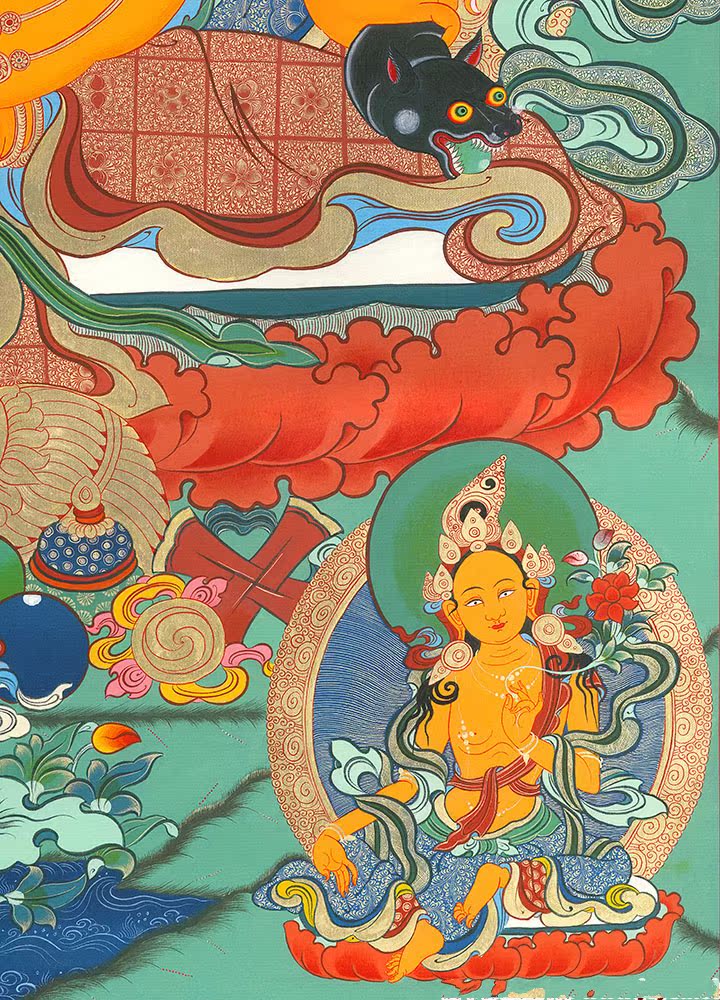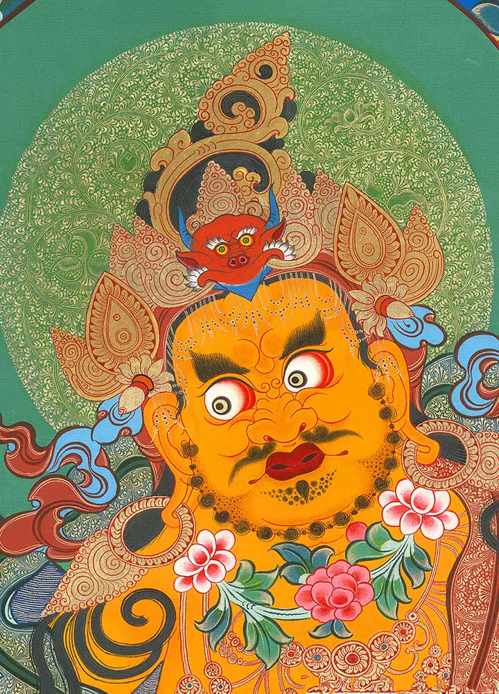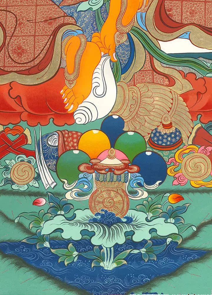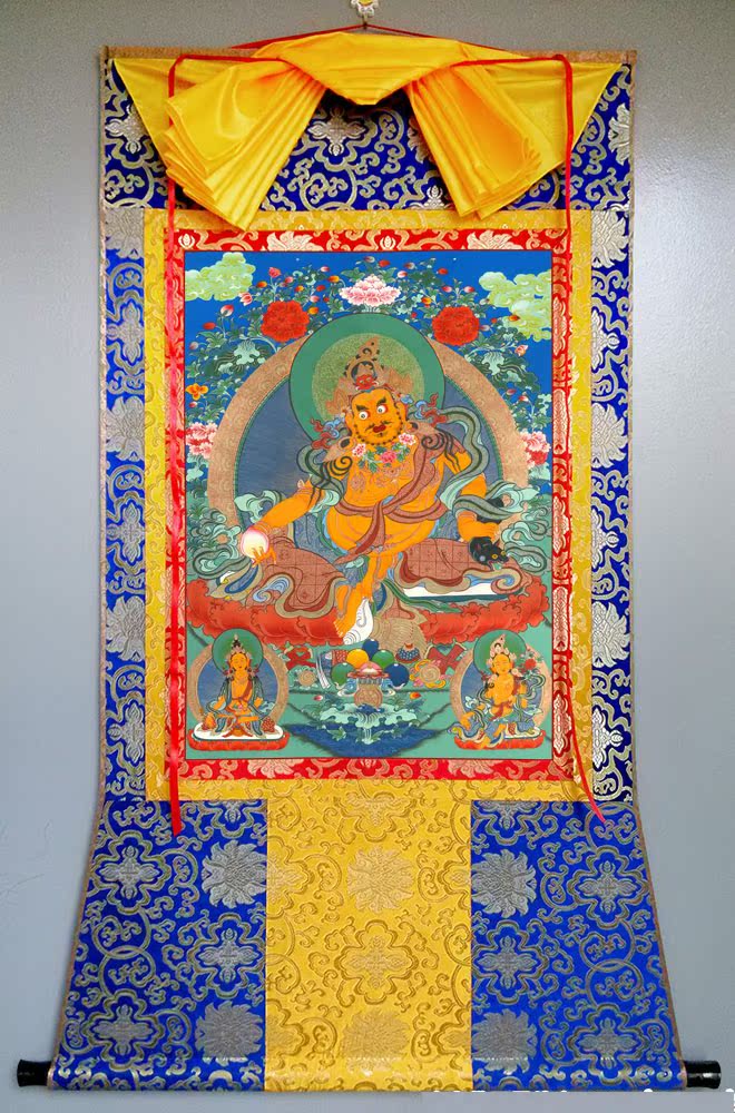 因是佛教圣相,所以我們選用的裝裱材料均是現在能有的最好的裝裱材料,正面選用定制的高檔棉織金絲錦緞很多仿制的是化纖材料,織繡藏傳佛教的富貴蓮花圖案,背面使用加厚仿真絲黃色綢緞布,手工精細裝裱而成,帶掛軸,照面,可直接懸掛到墻上。
