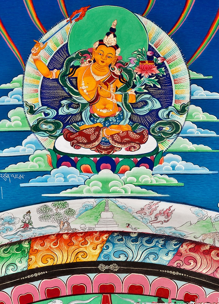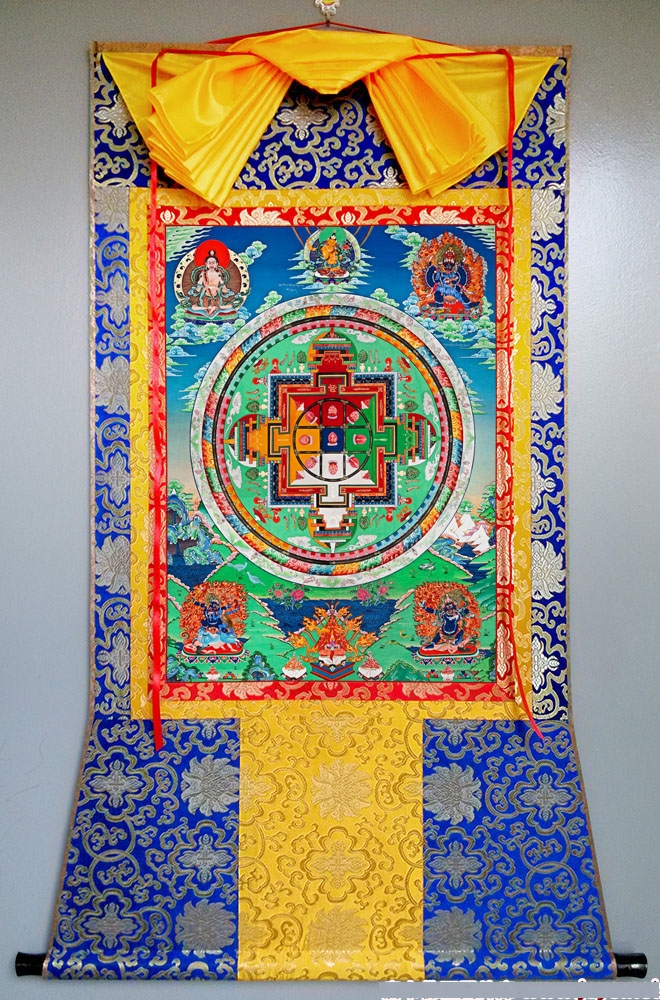 因是佛教圣相,所以我們選用的裝裱材料均是現在能有的最好的裝裱材料,正面選用定制的高檔棉織金絲錦緞很多仿制的是化纖材料,織繡藏傳佛教的富貴蓮花圖案,背面使用加厚仿真絲黃色綢緞布,手工精細裝裱而成,帶掛軸,照面,可直接懸掛到墻上。