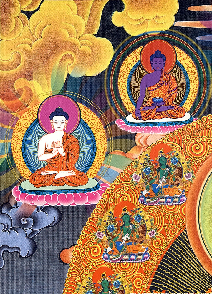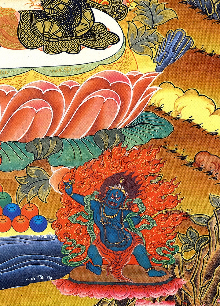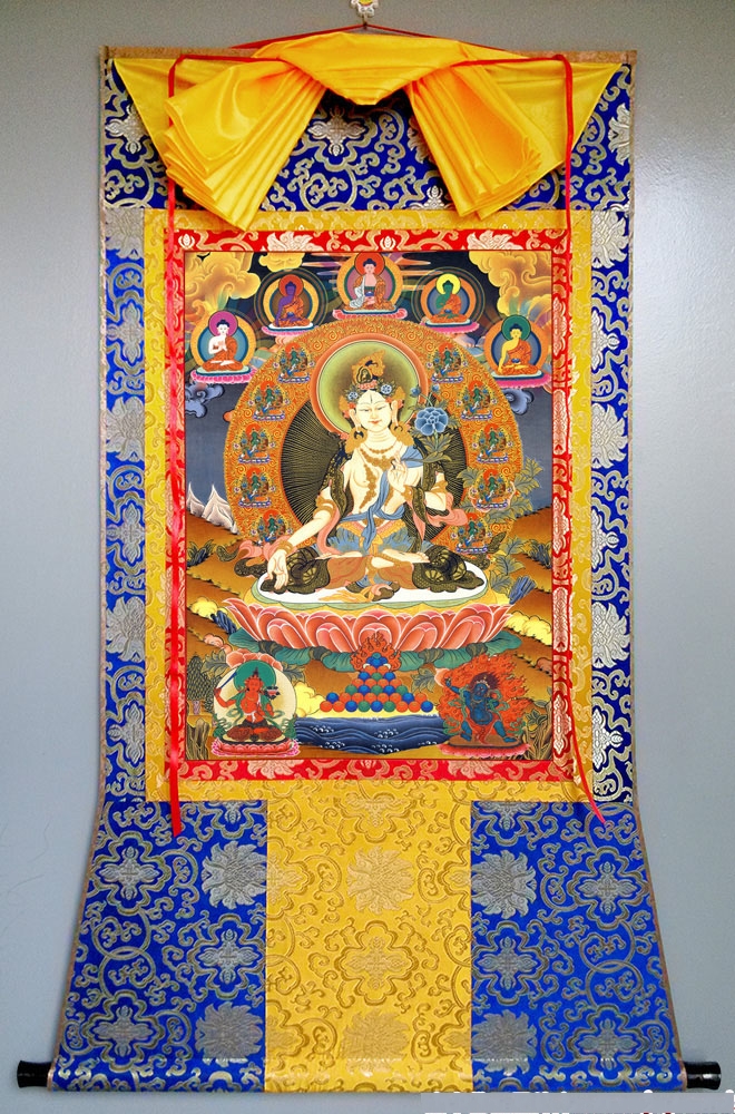 因是佛教圣相,所以我們選用的裝裱材料均是現在能有的最好的裝裱材料,正面選用定制的高檔棉織金絲錦緞很多仿制的是化纖材料,織繡藏傳佛教的富貴蓮花圖案,背面使用加厚仿真絲黃色綢緞布,手工精細裝裱而成,帶掛軸,照面,可直接懸掛到墻上。