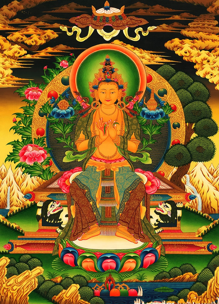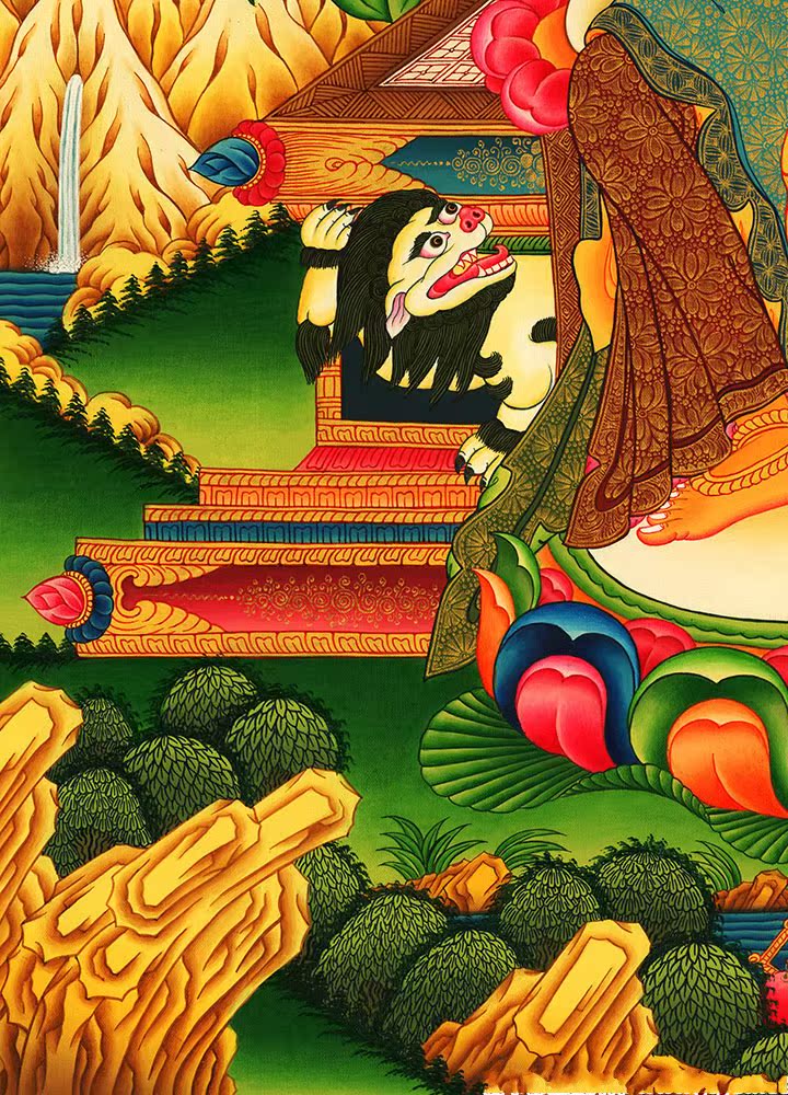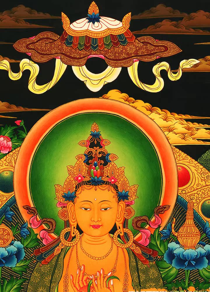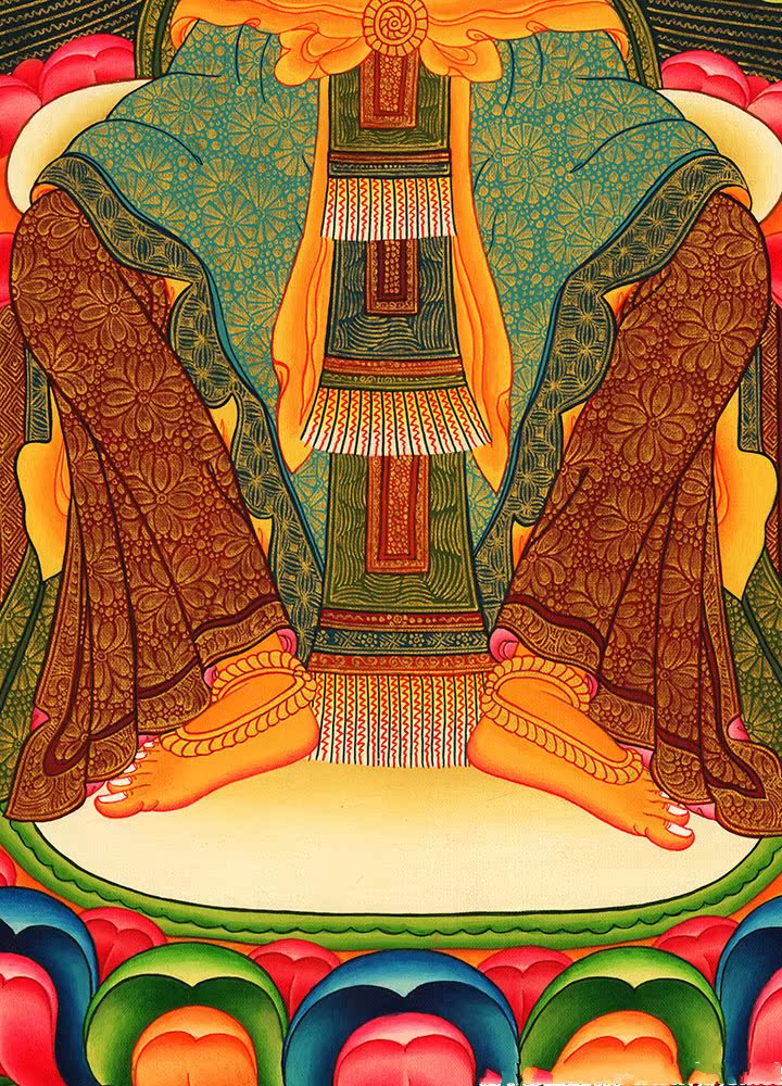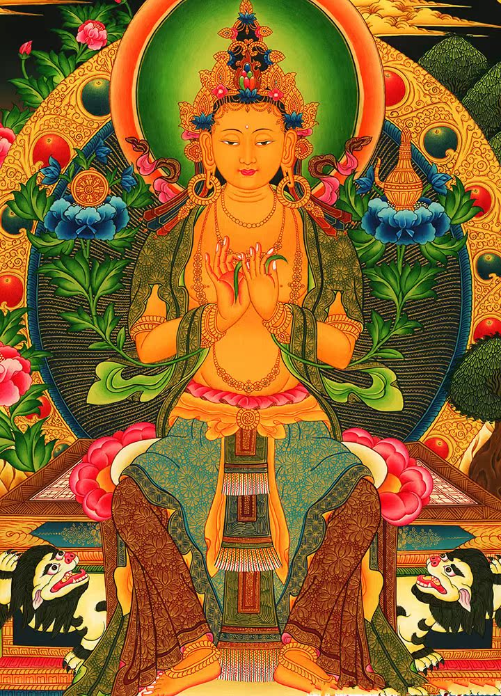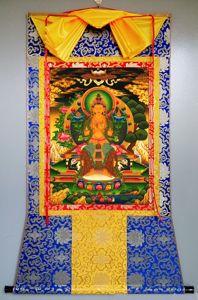 因是佛教圣相,所以我們選用的裝裱材料均是現在能有的最好的裝裱材料,正面選用定制的高檔棉織金絲錦緞很多仿制的是化纖材料,織繡藏傳佛教的富貴蓮花圖案,背面使用加厚仿真絲黃色綢緞布,手工精細裝裱而成,帶掛軸,照面,可直接懸掛到墻上。
