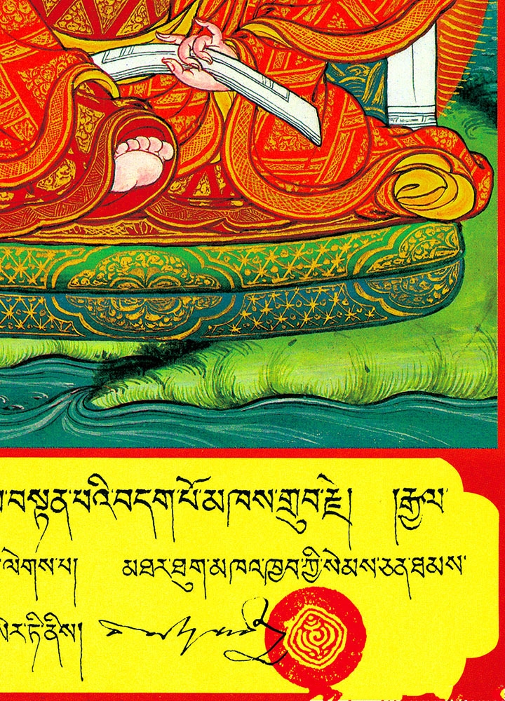 因是佛教圣相,所以我們選用的裝裱材料均是現在能有的最好的裝裱材料,正面選用定制的高檔棉織金絲錦緞很多仿制的是化纖材料,織繡藏傳佛教的富貴蓮花圖案,背面使用加厚仿真絲黃色綢緞布,手工精細裝裱而成,帶掛軸,照面,可直接懸掛到墻上。