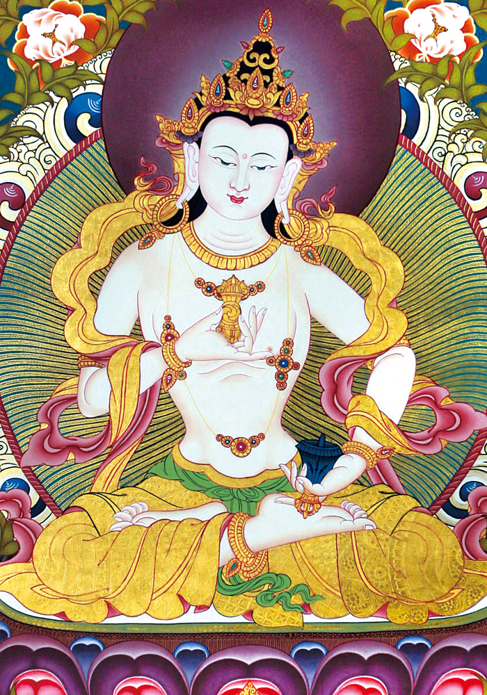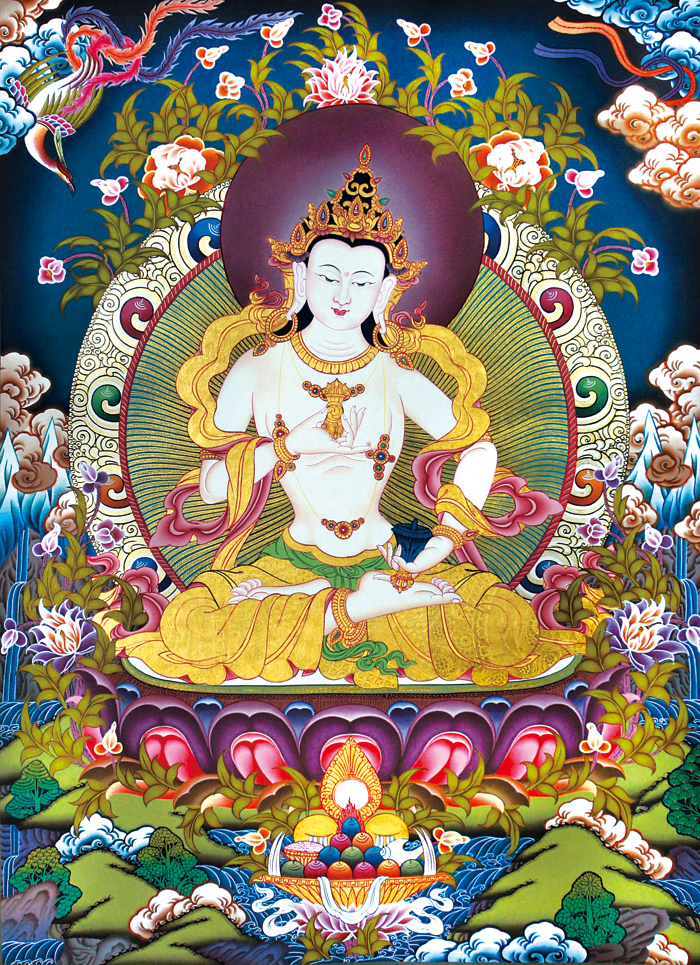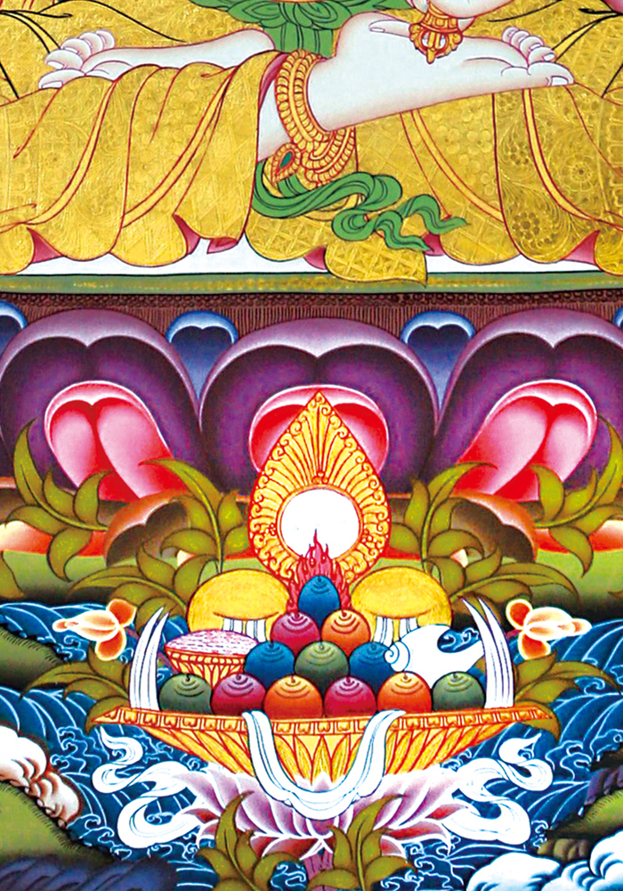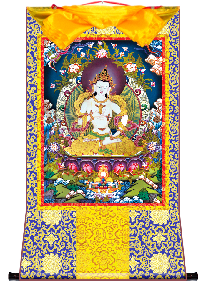 因是佛教圣相,所以我們選用的裝裱材料均是現在能有的最好的裝裱材料,正面選用定制的高檔棉織金絲錦緞很多仿制的是化纖材料,織繡藏傳佛教的富貴蓮花圖案,背面使用加厚仿真絲黃色綢緞布,手工精細裝裱而成,帶掛軸,照面,可直接懸掛到墻上。 <
