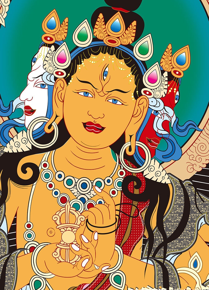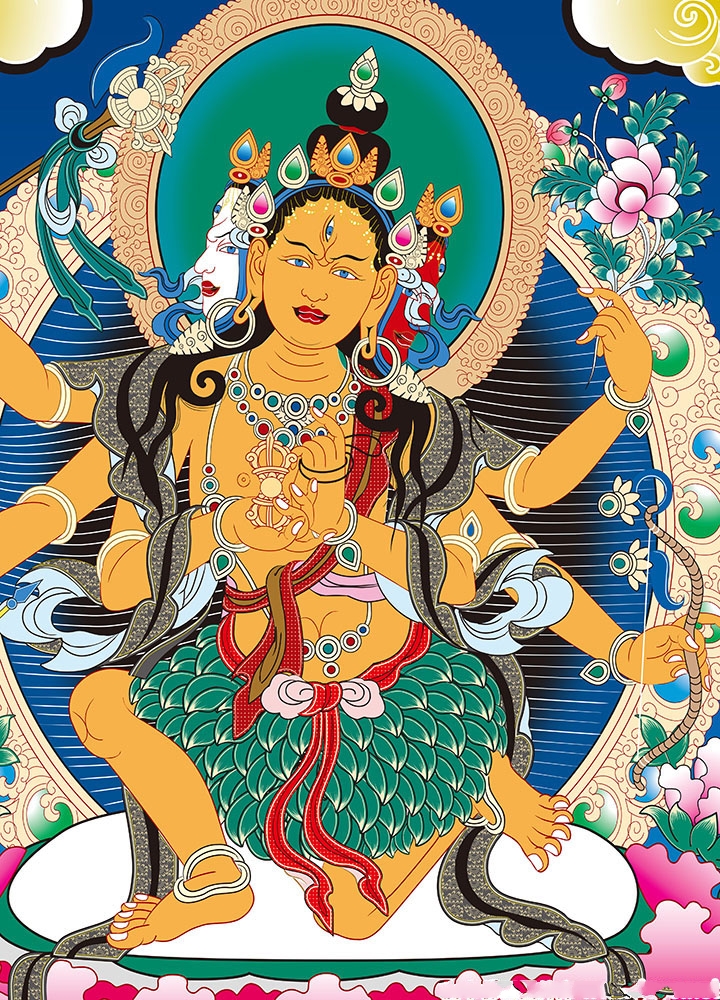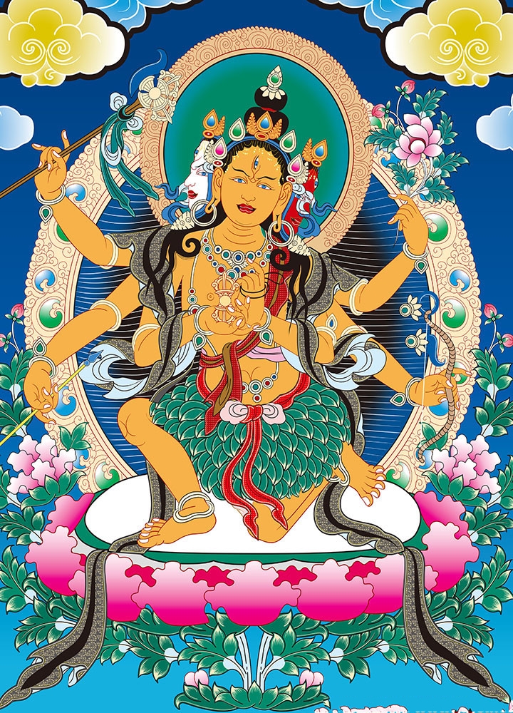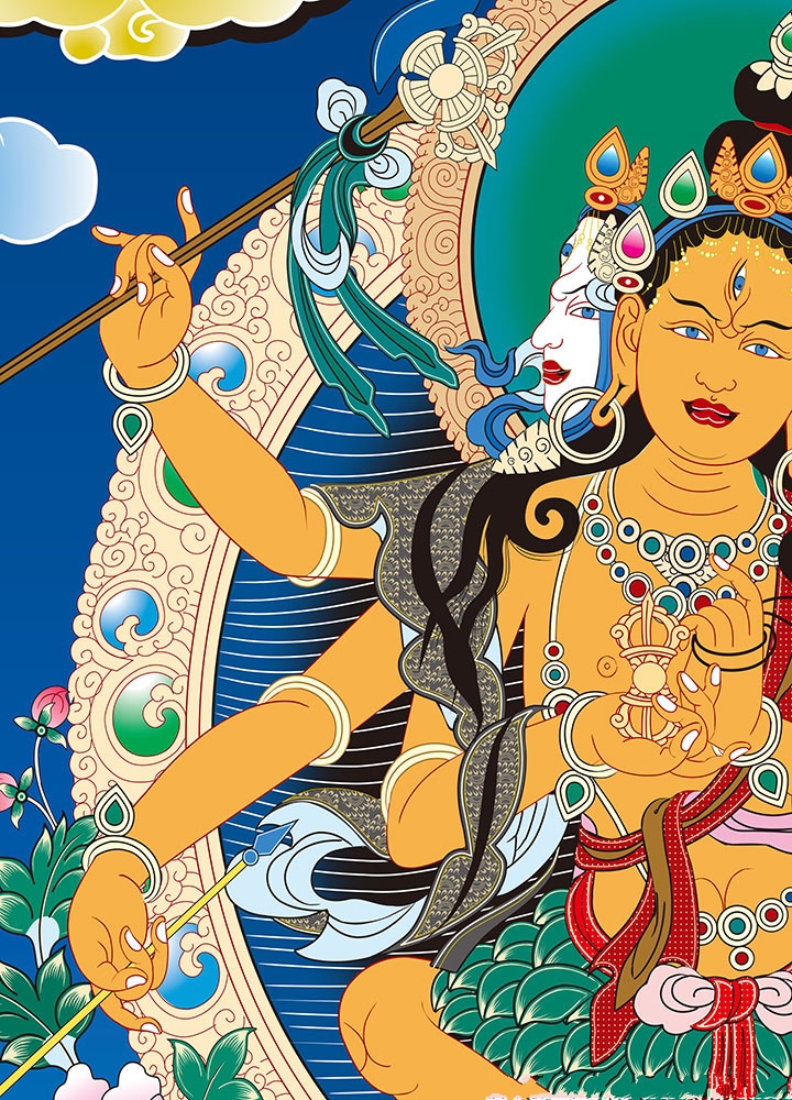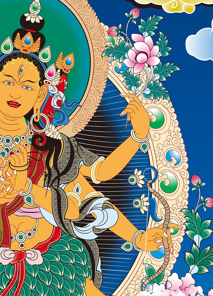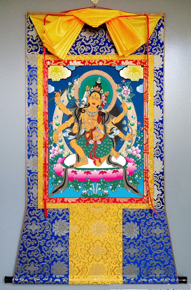 因是佛教圣相,所以我們選用的裝裱材料均是現在能有的最好的裝裱材料,正面選用定制的高檔棉織金絲錦緞很多仿制的是化纖材料,織繡藏傳佛教的富貴蓮花圖案,背面使用加厚仿真絲黃色綢緞布,手工精細裝裱而成,帶掛軸,照面,可直接懸掛到墻上。