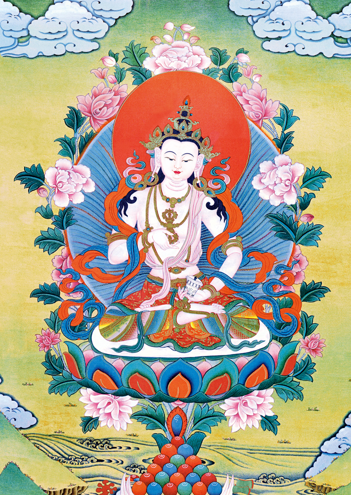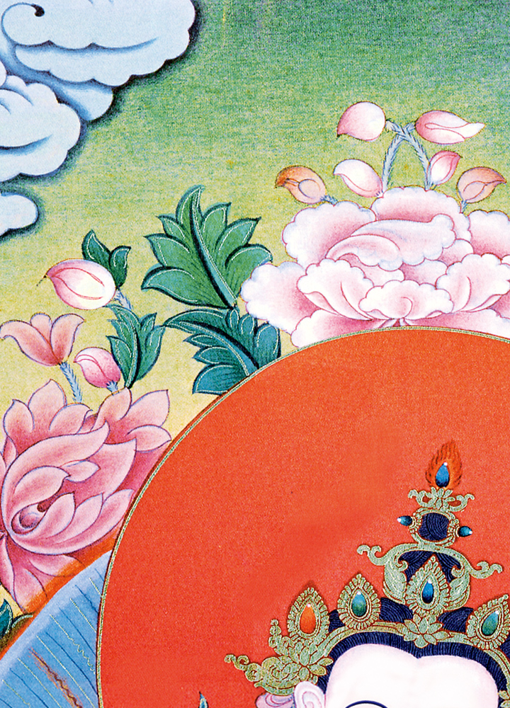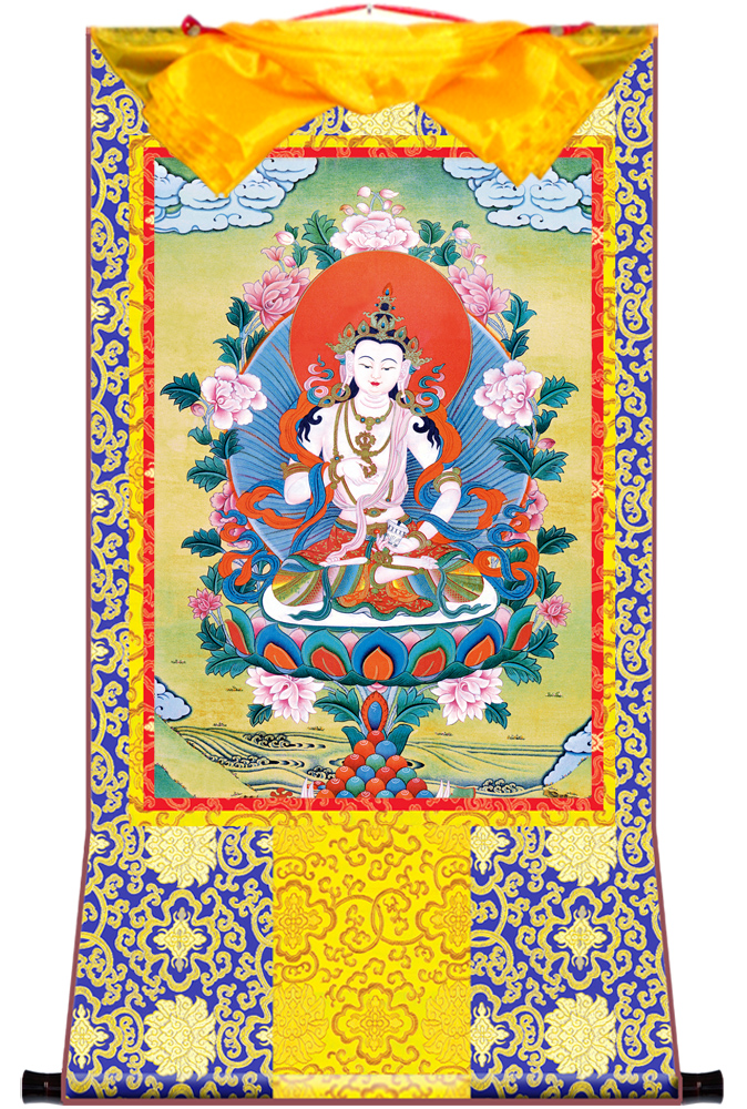 因是佛教圣相,所以我們選用的裝裱材料均是現在能有的最好的裝裱材料,正面選用定制的高檔棉織金絲錦緞很多仿制的是化纖材料,織繡藏傳佛教的富貴蓮花圖案,背面使用加厚仿真絲黃色綢緞布,手工精細裝裱而成,帶掛軸,照面,可直接懸掛到墻上。
