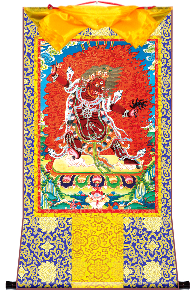因是佛教圣相,所以我們選用的裝裱材料均是現在能有的最好的裝裱材料,正面選用定制的高檔棉織金絲錦緞很多仿制的是化纖材料,織繡藏傳佛教的富貴蓮花圖案,背面使用加厚仿真絲黃色綢緞布,手工精細裝裱而成,帶掛軸,照面,可直接懸掛到墻上。