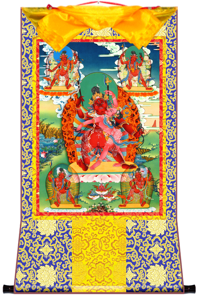 因是佛教圣相,所以我們選用的裝裱材料均是現在能有的最好的裝裱材料,正面選用定制的高檔棉織金絲錦緞很多仿制的是化纖材料,織繡藏傳佛教的富貴蓮花圖案,背面使用加厚仿真絲黃色綢緞布,手工精細裝裱而成,帶掛軸,照面,可直接懸掛到墻上。