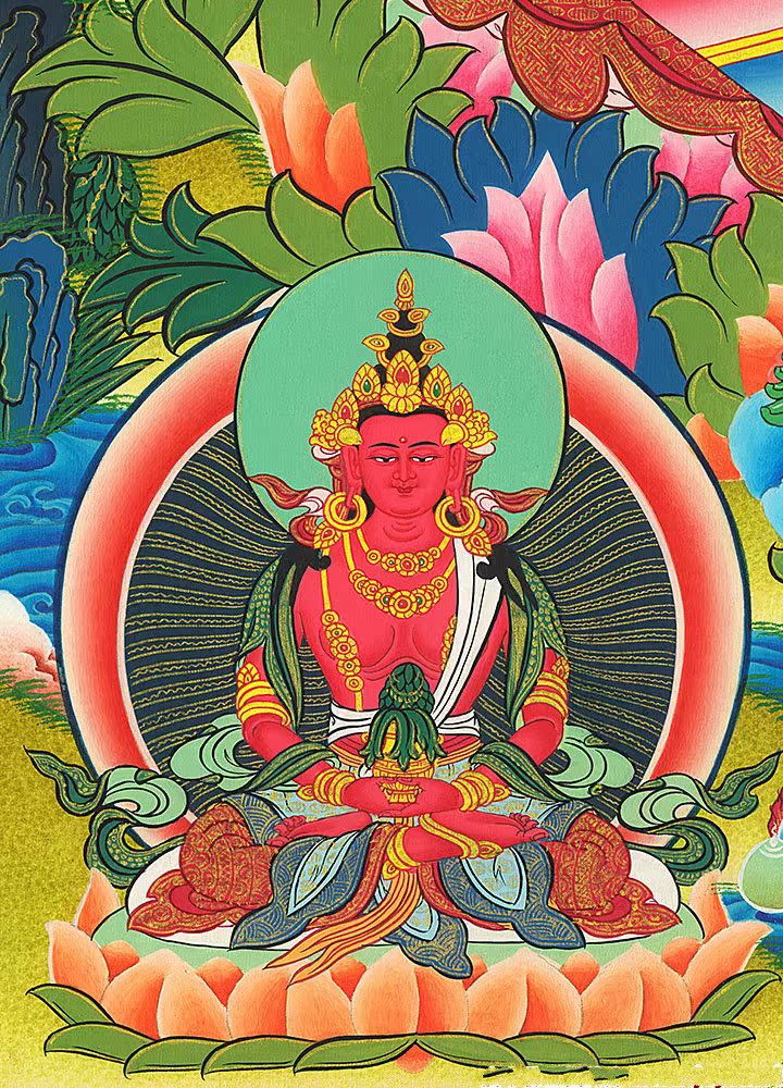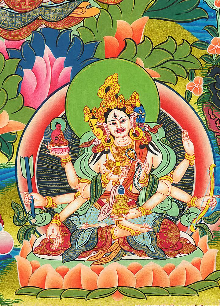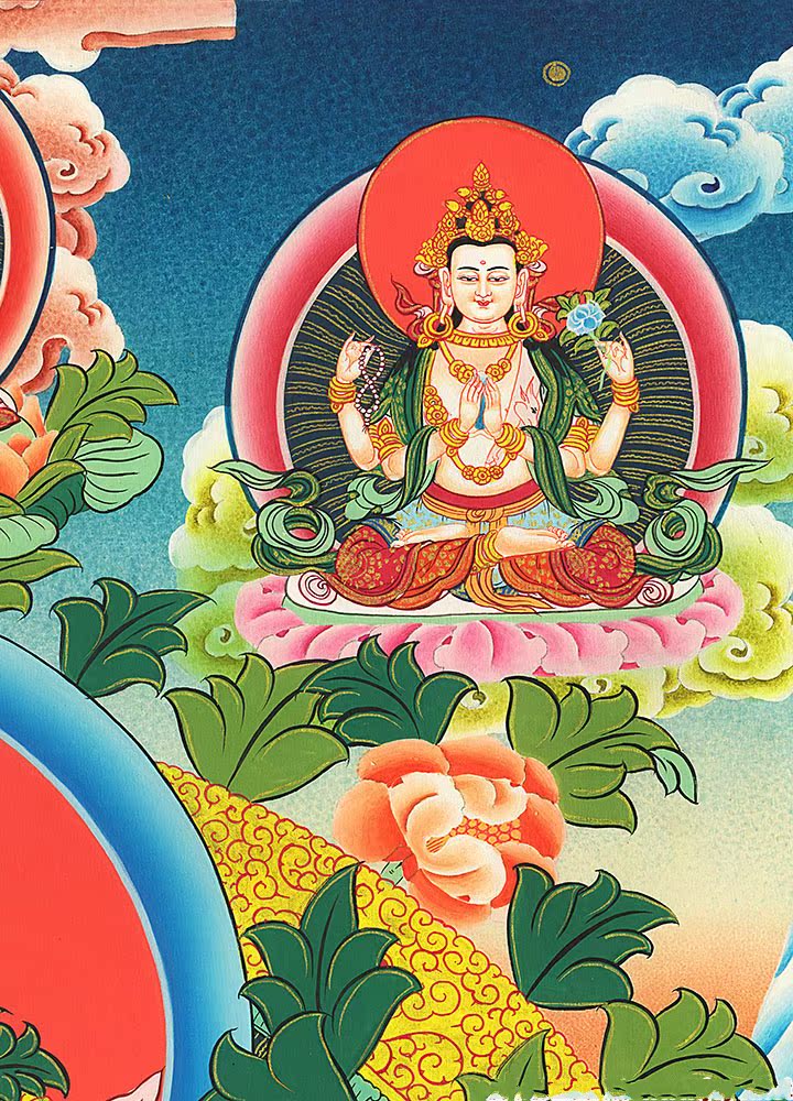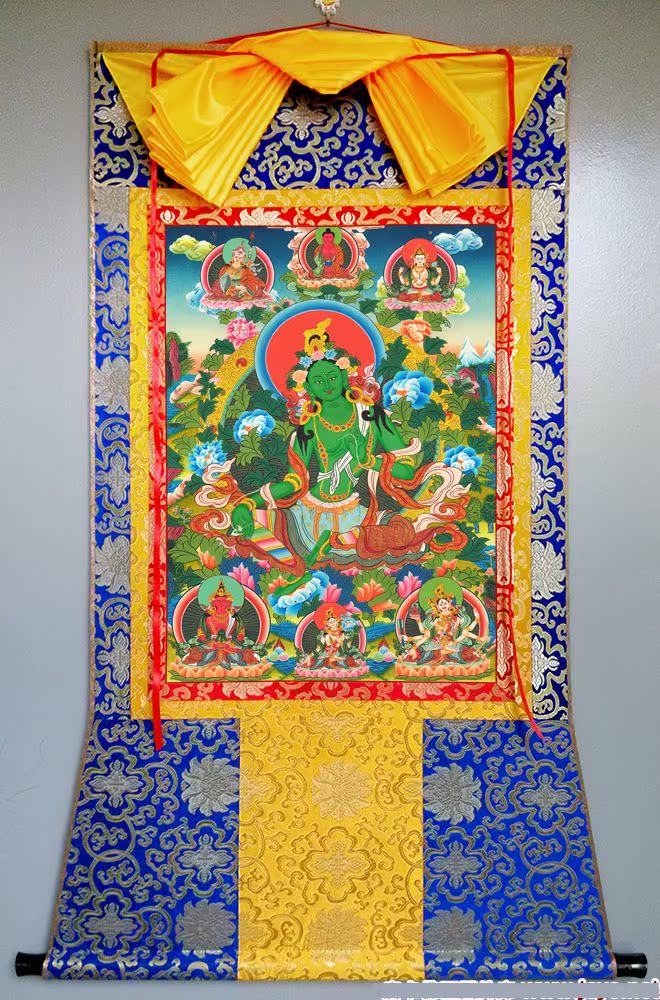 因是佛教圣相,所以我們選用的裝裱材料均是現在能有的最好的裝裱材料,正面選用定制的高檔棉織金絲錦緞很多仿制的是化纖材料,織繡藏傳佛教的富貴蓮花圖案,背面使用加厚仿真絲黃色綢緞布,手工精細裝裱而成,帶掛軸,照面,可直接懸掛到墻上。