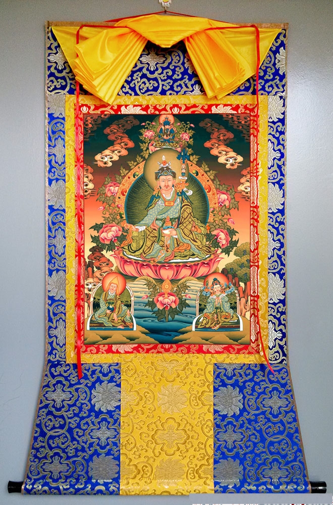 因是佛教圣相,所以我們選用的裝裱材料均是現在能有的最好的裝裱材料,正面選用定制的高檔棉織金絲錦緞很多仿制的是化纖材料,織繡藏傳佛教的富貴蓮花圖案,背面使用加厚仿真絲黃色綢緞布,手工精細裝裱而成,帶掛軸,照面,可直接懸掛到墻上。