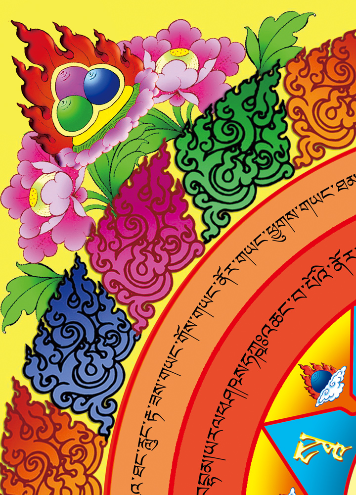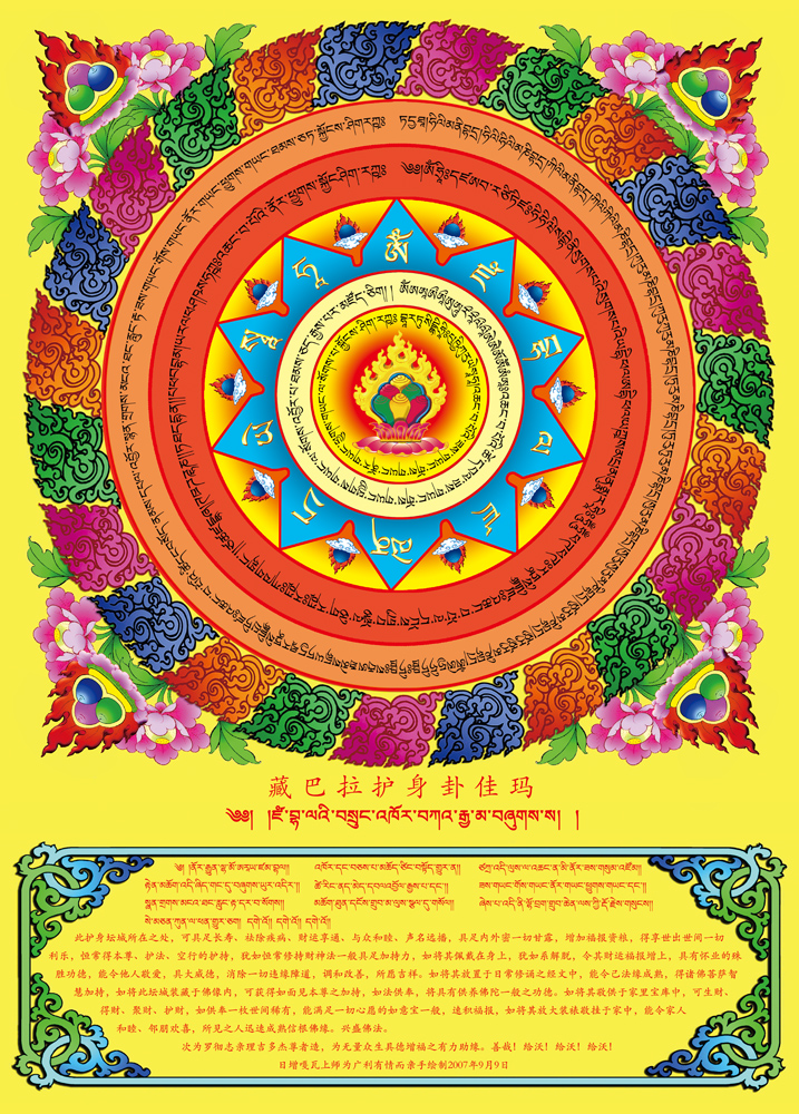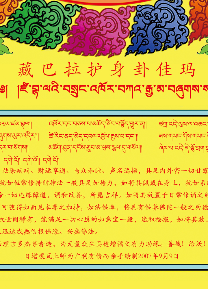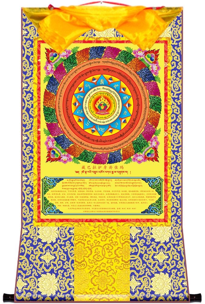 此護身壇城所在之處,可具足長壽、祛除疾病、財運享通、與眾和睦、聲名遠播,具足內外密一切甘露,增加福報資糧,得享世出世間一切利樂,恒常得本尊、護法、空行的護持,猶如恒常修持財神法一般具足加持力,如將其佩戴在身上,猶如系解脫,令其財運福報增上,具有懷業的殊勝功德,能令他人敬愛,具大威德,消除一切違緣障道,調和改善,所愿吉祥。如將其放置于日常修誦之經文中,能令己法緣成熟,得諸佛菩薩智慧加持,如將此壇城裝藏于佛像內,可獲得如面見本尊之加持,如法供奉,將具有供養佛陀一般之功德。如將其敬供于家里寶庫中,可生財、得財、聚財、護財,如供奉一枚世間稀有,能足一切心愿的如意寶一般,速積福報,如將其放大裝裱敬掛于家中,能令家人和睦、鄰朋歡喜,所見之人迅速成熟信根佛緣。興盛佛法。此為羅徹志親理吉多杰尊者造,為無量眾生具德增福之有力助緣。 唐卡的裝裱款式有很多種,我們選用了最為傳統的一種,這種裝裱方式多為寺廟使用,代表的意義也很殊勝。