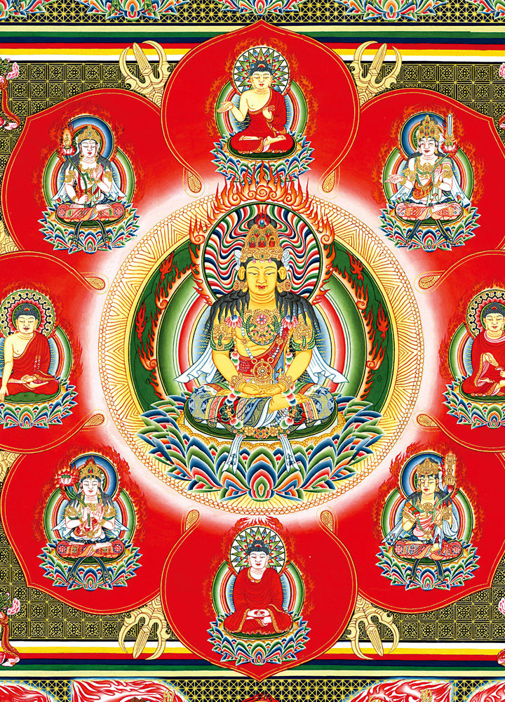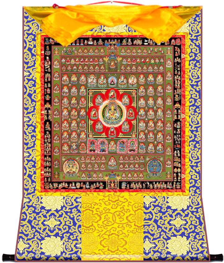 因是佛教圣相,所以我們選用的裝裱材料均是現在能有的最好的裝裱材料,正面選用定制的高檔棉織金絲錦緞很多仿制的是化纖材料,織繡藏傳佛教的富貴蓮花圖案,背面使用加厚仿真絲黃色綢緞布,手工精細裝裱而成,帶掛軸,照面,可直接懸掛到墻上。