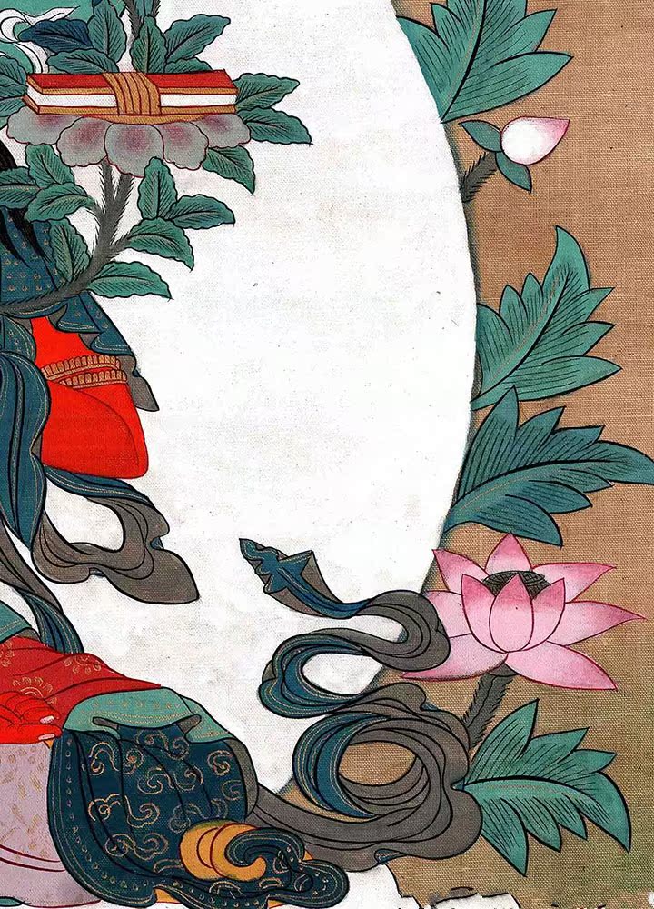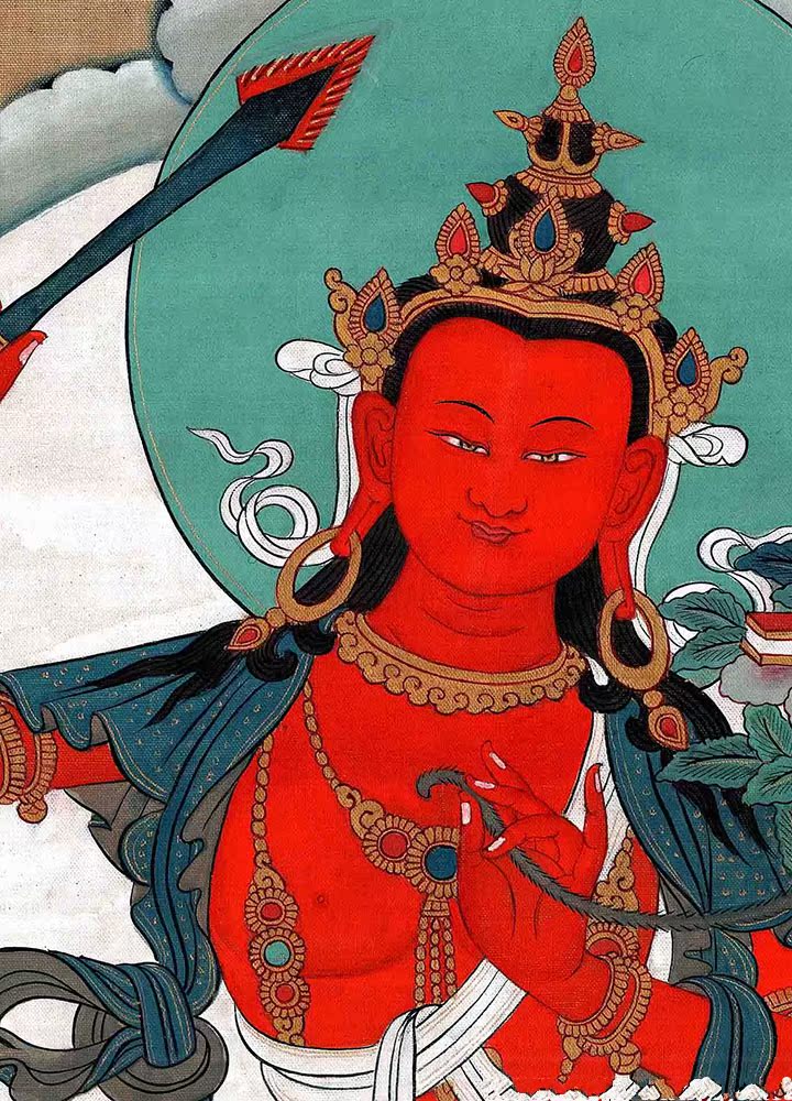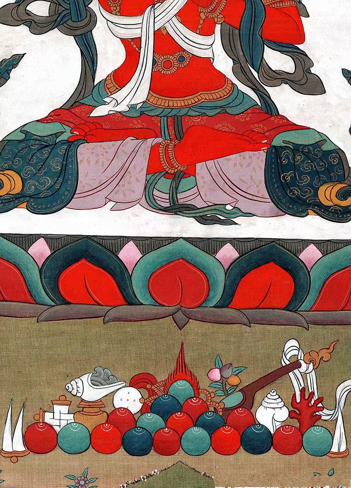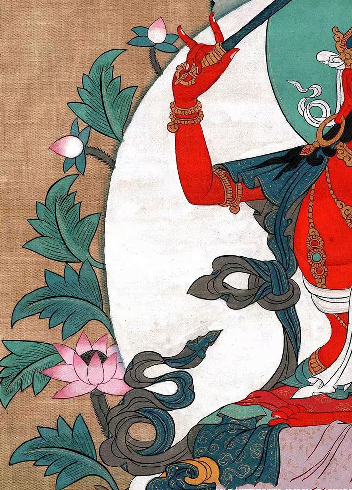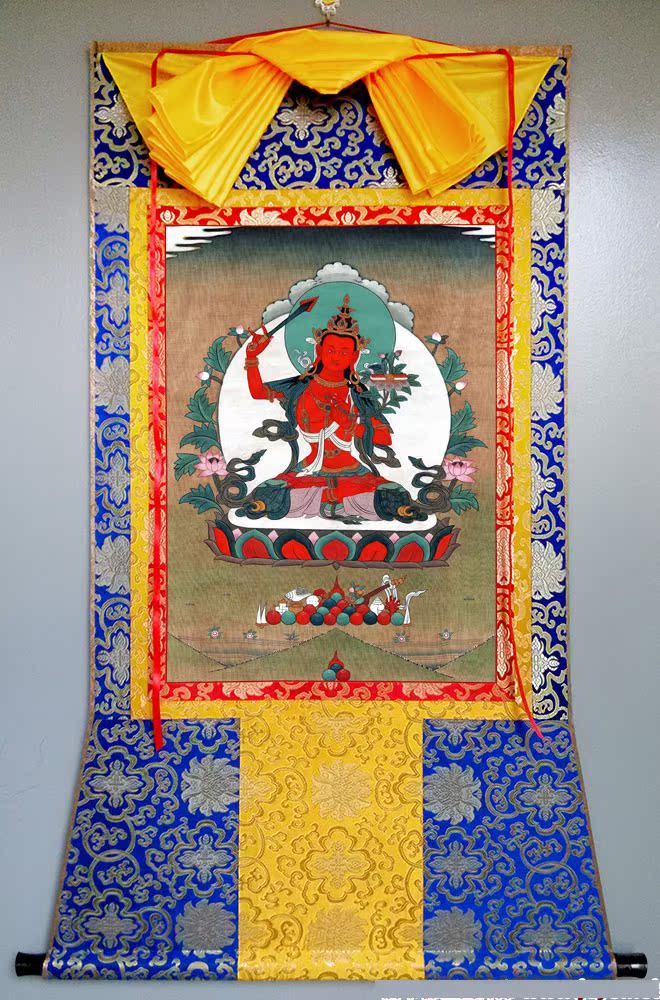 因是佛教圣相,所以我們選用的裝裱材料均是現在能有的最好的裝裱材料,正面選用定制的高檔棉織金絲錦緞很多仿制的是化纖材料,織繡藏傳佛教的富貴蓮花圖案,背面使用加厚仿真絲黃色綢緞布,手工精細裝裱而成,帶掛軸,照面,可直接懸掛到墻上。