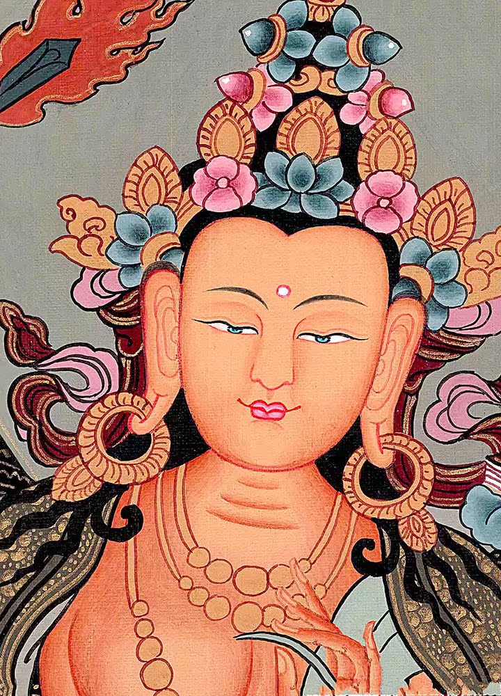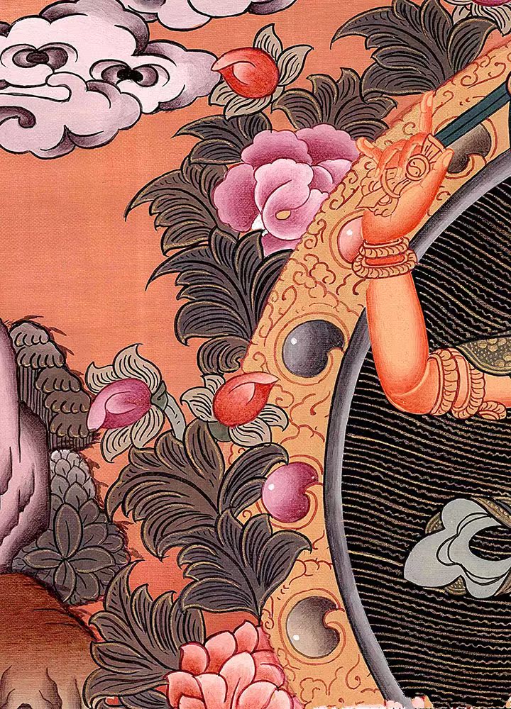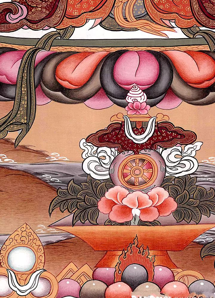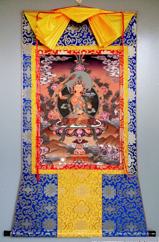因是佛教圣相,所以我們選用的裝裱材料均是現在能有的最好的裝裱材料,正面選用定制的高檔棉織金絲錦緞很多仿制的是化纖材料,織繡藏傳佛教的富貴蓮花圖案,背面使用加厚仿真絲黃色綢緞布,手工精細裝裱而成,帶掛軸,照面,可直接懸掛到墻上。