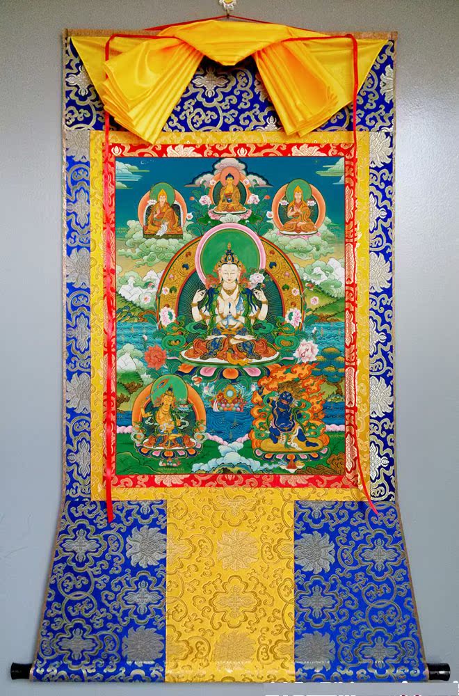 因是佛教圣相,所以我們選用的裝裱材料均是現在能有的最好的裝裱材料,正面選用定制的高檔棉織金絲錦緞很多仿制的是化纖材料,織繡藏傳佛教的富貴蓮花圖案,背面使用加厚仿真絲黃色綢緞布,手工精細裝裱而成,帶掛軸,照面,可直接懸掛到墻上。
