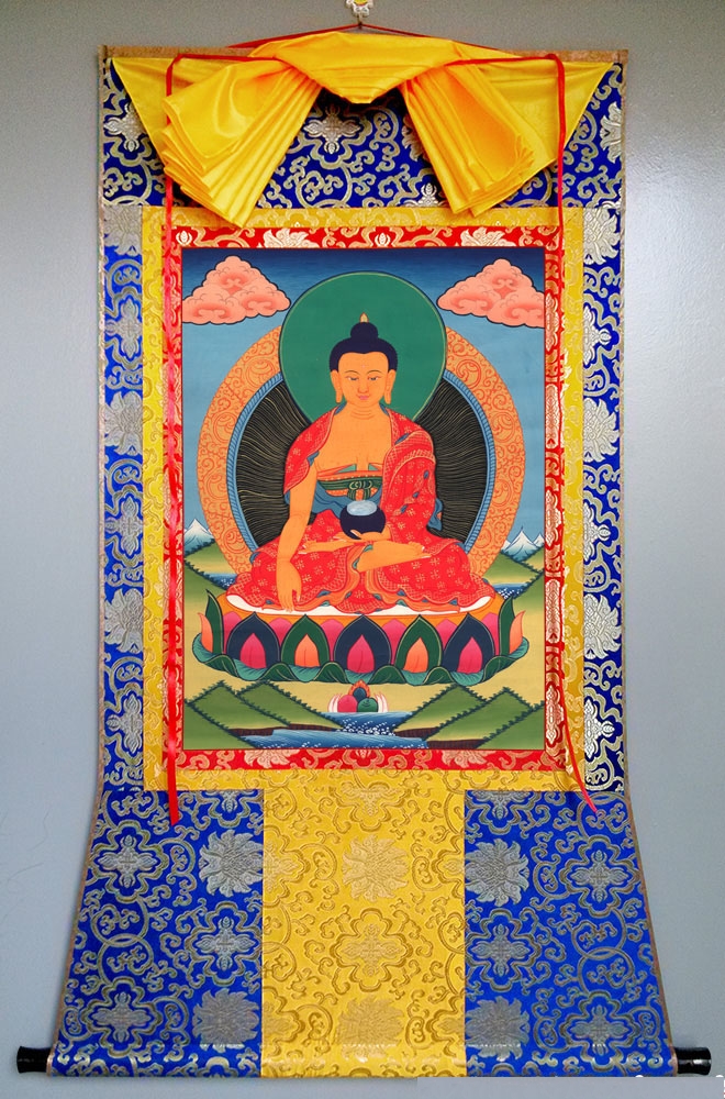 因是佛教圣相,所以我們選用的裝裱材料均是現在能有的最好的裝裱材料,正面選用定制的高檔棉織金絲錦緞很多仿制的是化纖材料,織繡藏傳佛教的富貴蓮花圖案,背面使用加厚仿真絲黃色綢緞布,手工精細裝裱而成,帶掛軸,照面,可直接懸掛到墻上。