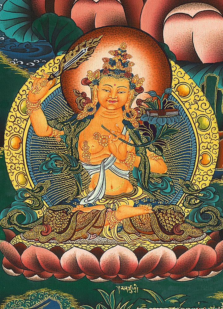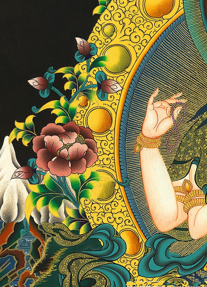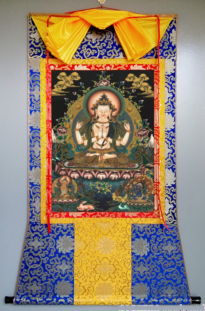 因是佛教圣相,所以我們選用的裝裱材料均是現在能有的最好的裝裱材料,正面選用定制的高檔棉織金絲錦緞很多仿制的是化纖材料,織繡藏傳佛教的富貴蓮花圖案,背面使用加厚仿真絲黃色綢緞布,手工精細裝裱而成,帶掛軸,照面,可直接懸掛到墻上。