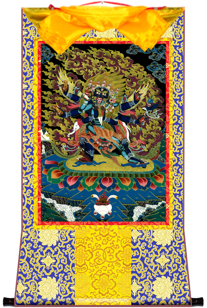 因是佛教圣相,所以我們選用的裝裱材料均是現在能有的最好的裝裱材料,正面選用定制的高檔棉織金絲錦緞很多仿制的是化纖材料,織繡藏傳佛教的富貴蓮花圖案,背面使用加厚仿真絲黃色綢緞布,手工精細裝裱而成,帶掛軸,照面,可直接懸掛到墻上。