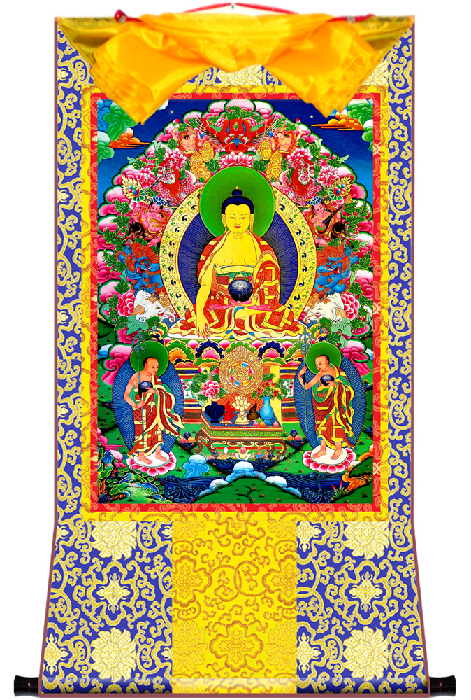 因是佛教圣相,所以我們選用的裝裱材料均是現在能有的最好的裝裱材料,正面選用定制的高檔棉織金絲錦緞很多仿制的是化纖材料,織繡藏傳佛教的富貴蓮花圖案,背面使用加厚仿真絲黃色綢緞布,手工精細裝裱而成,帶掛軸,照面,可直接懸掛到墻上。
