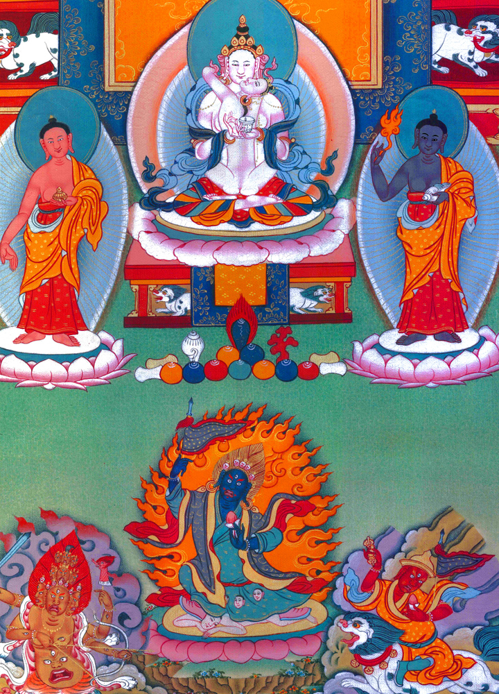 因是佛教圣相,所以我們選用的裝裱材料均是現在能有的最好的裝裱材料,正面選用定制的高檔棉織金絲錦緞很多仿制的是化纖材料,織繡藏傳佛教的富貴蓮花圖案,背面使用加厚仿真絲黃色綢緞布,手工精細裝裱而成,帶掛軸,照面,可直接懸掛到墻上。