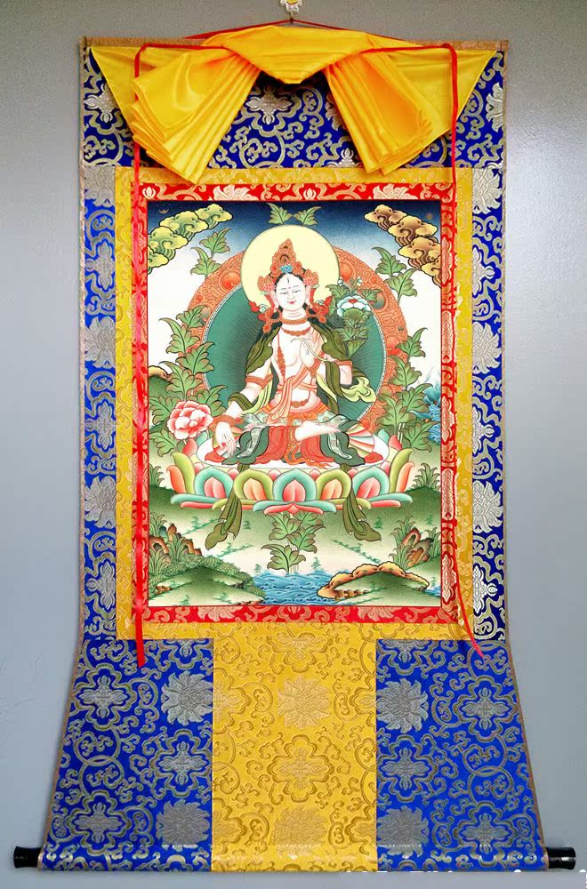 因是佛教圣相,所以我們選用的裝裱材料均是現在能有的最好的裝裱材料,正面選用定制的高檔棉織金絲錦緞很多仿制的是化纖材料,織繡藏傳佛教的富貴蓮花圖案,背面使用加厚仿真絲黃色綢緞布,手工精細裝裱而成,帶掛軸,照面,可直接懸掛到墻上。