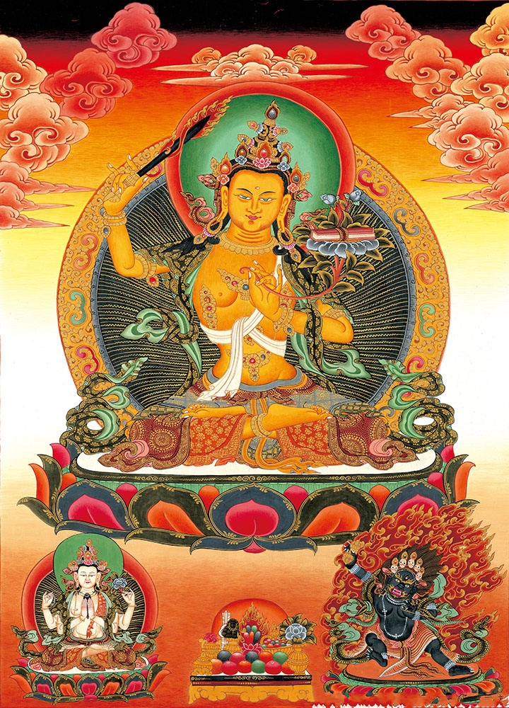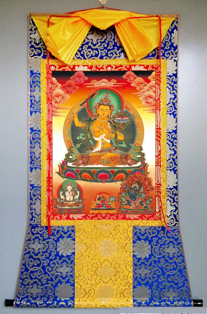 因是佛教圣相,所以我們選用的裝裱材料均是現在能有的最好的裝裱材料,正面選用定制的高檔棉織金絲錦緞很多仿制的是化纖材料,織繡藏傳佛教的富貴蓮花圖案,背面使用加厚仿真絲黃色綢緞布,手工精細裝裱而成,帶掛軸,照面,可直接懸掛到墻上。