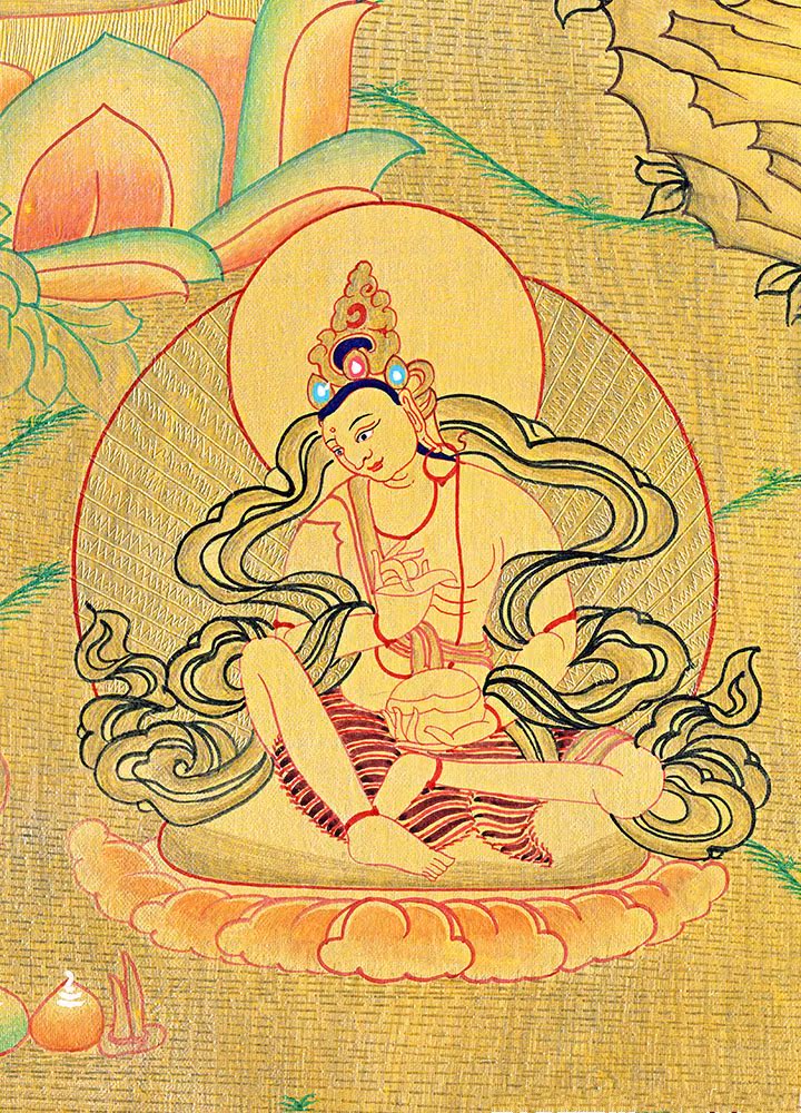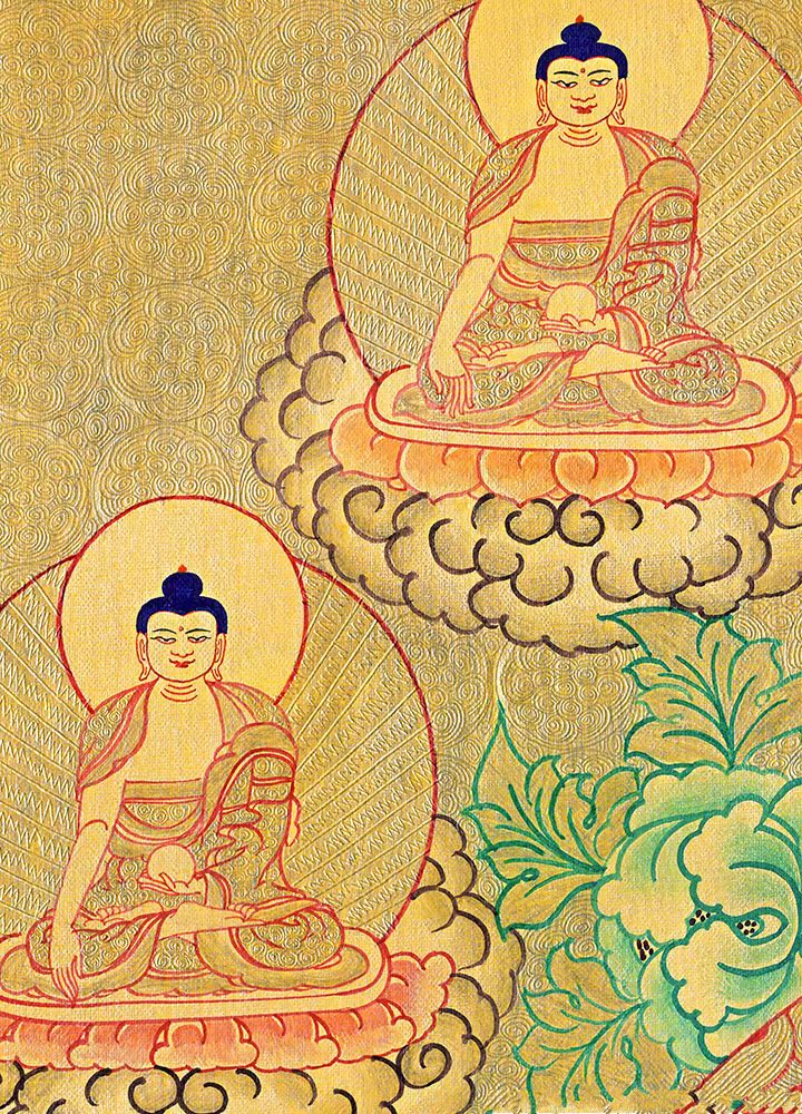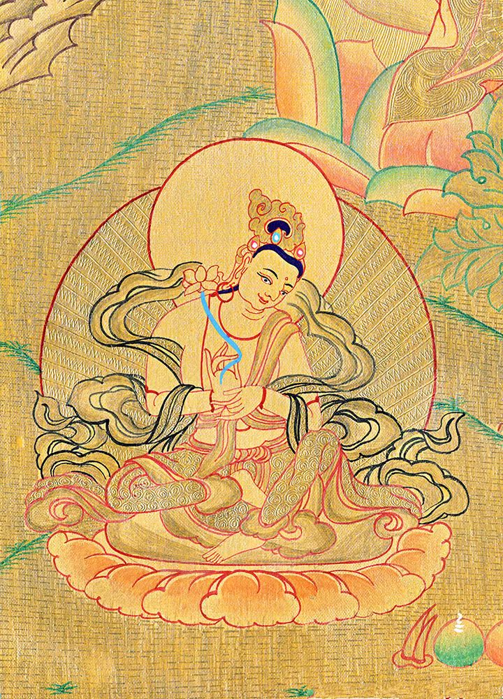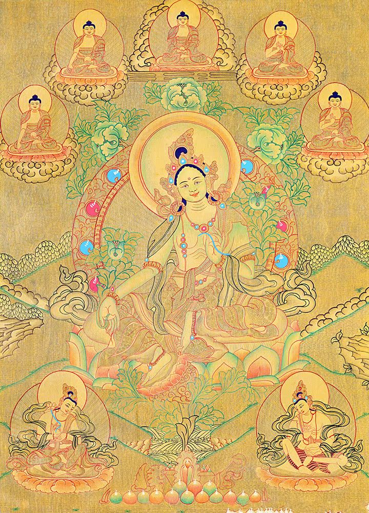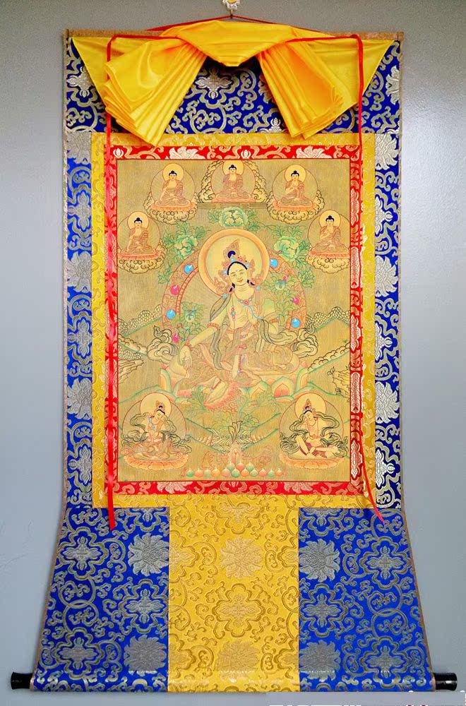 因是佛教圣相,所以我們選用的裝裱材料均是現在能有的最好的裝裱材料,正面選用定制的高檔棉織金絲錦緞很多仿制的是化纖材料,織繡藏傳佛教的富貴蓮花圖案,背面使用加厚仿真絲黃色綢緞布,手工精細裝裱而成,帶掛軸,照面,可直接懸掛到墻上。