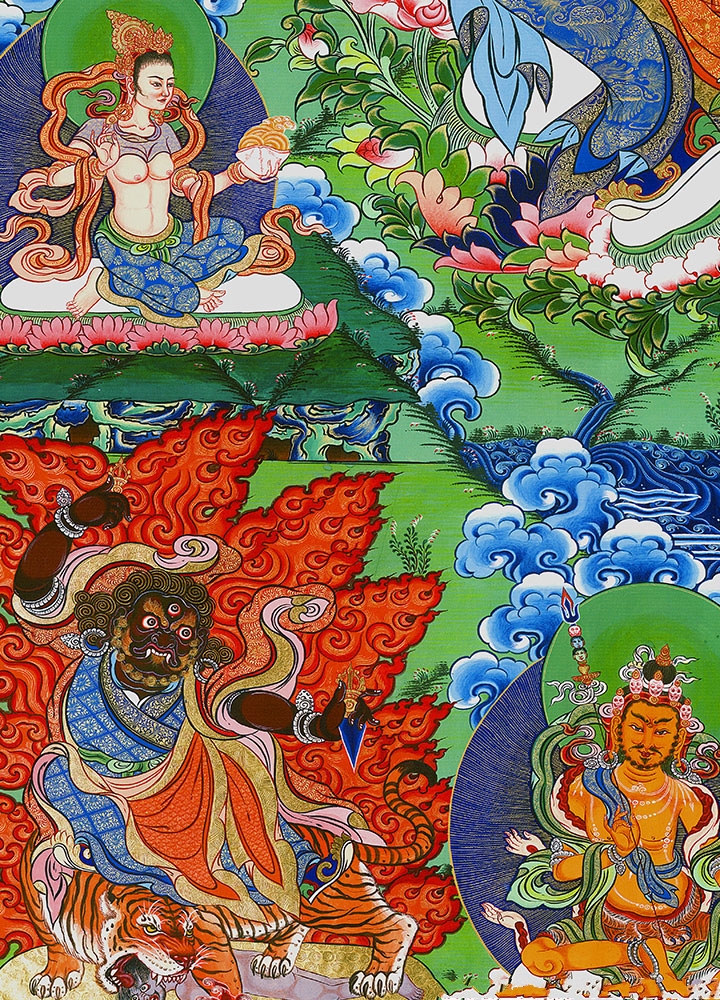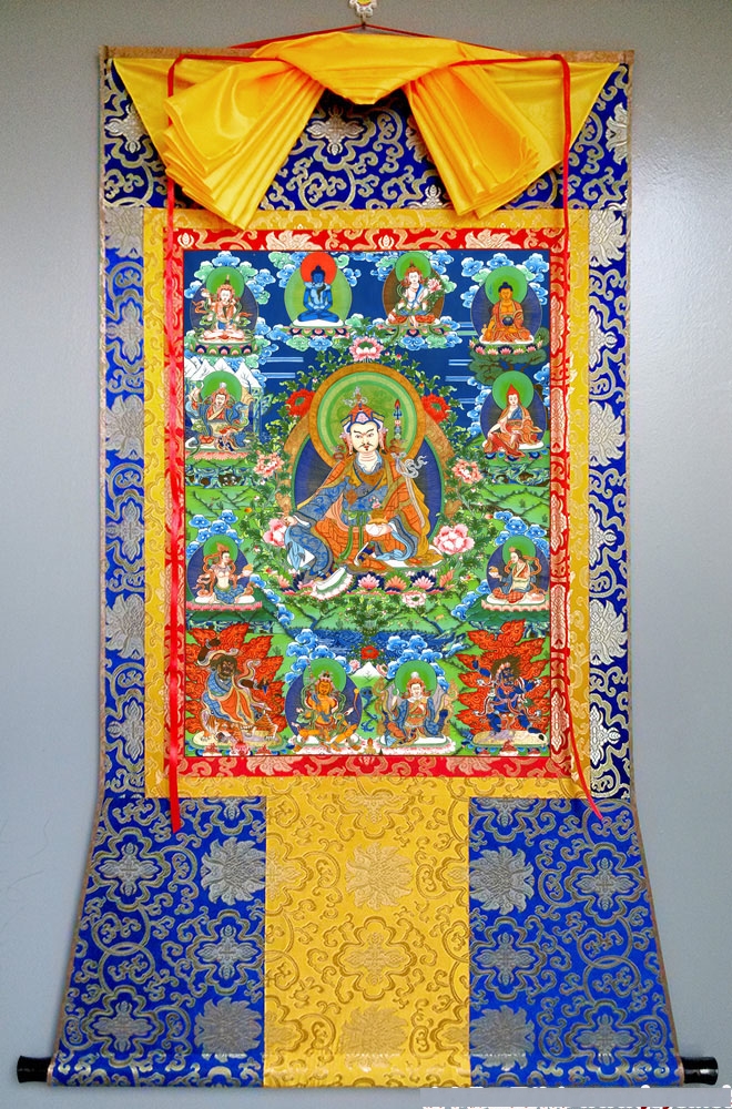因是佛教圣相,所以我們選用的裝裱材料均是現在能有的最好的裝裱材料,正面選用定制的高檔棉織金絲錦緞很多仿制的是化纖材料,織繡藏傳佛教的富貴蓮花圖案,背面使用加厚仿真絲黃色綢緞布,手工精細裝裱而成,帶掛軸,照面,可直接懸掛到墻上。