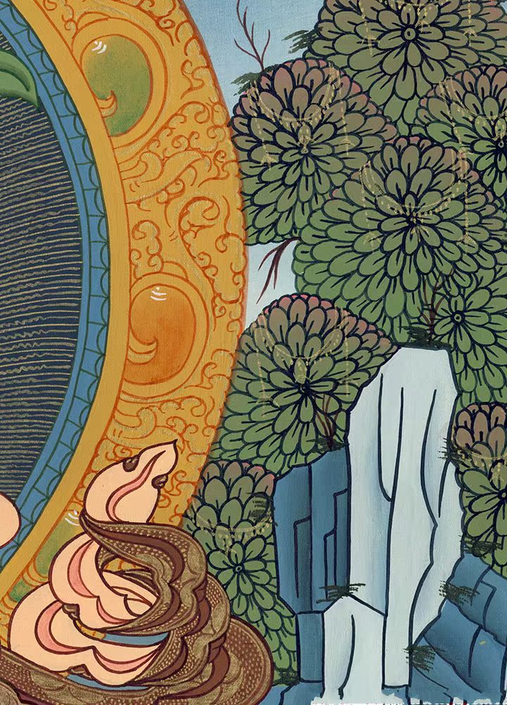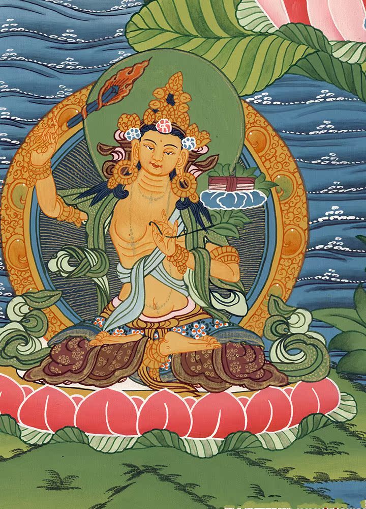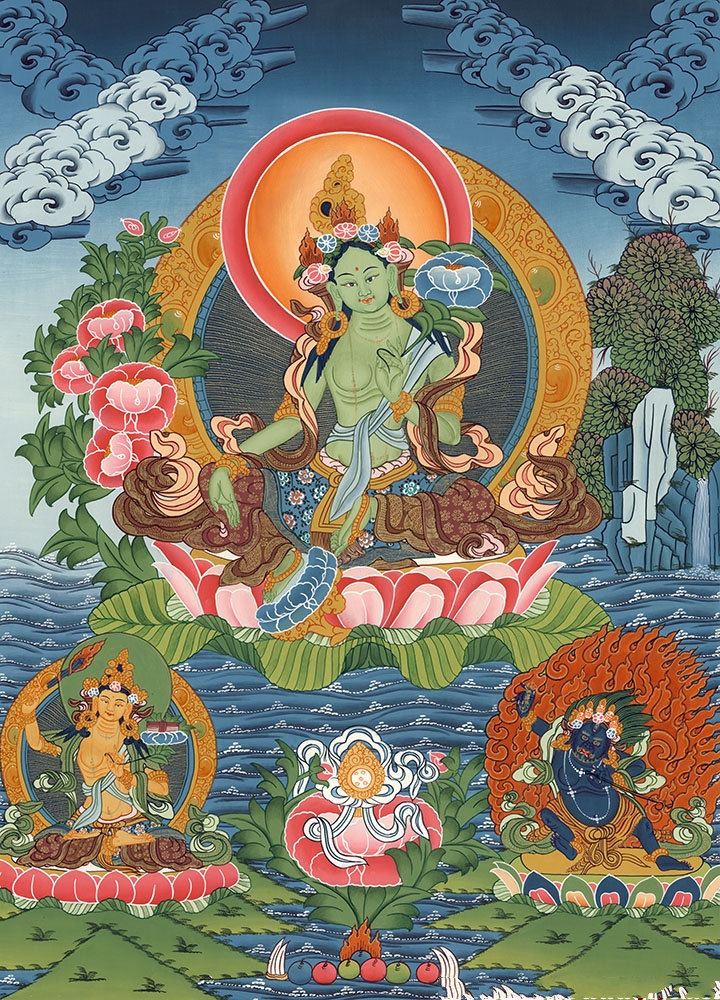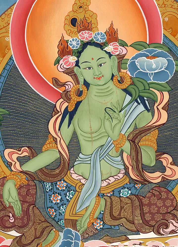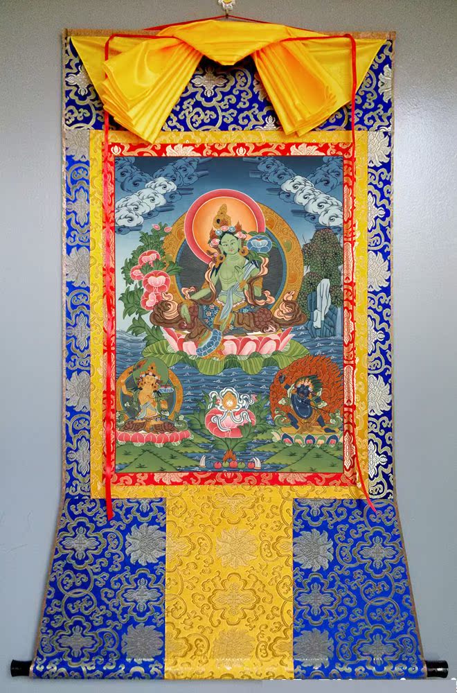 因是佛教圣相,所以我們選用的裝裱材料均是現在能有的最好的裝裱材料,正面選用定制的高檔棉織金絲錦緞很多仿制的是化纖材料,織繡藏傳佛教的富貴蓮花圖案,背面使用加厚仿真絲黃色綢緞布,手工精細裝裱而成,帶掛軸,照面,可直接懸掛到墻上。