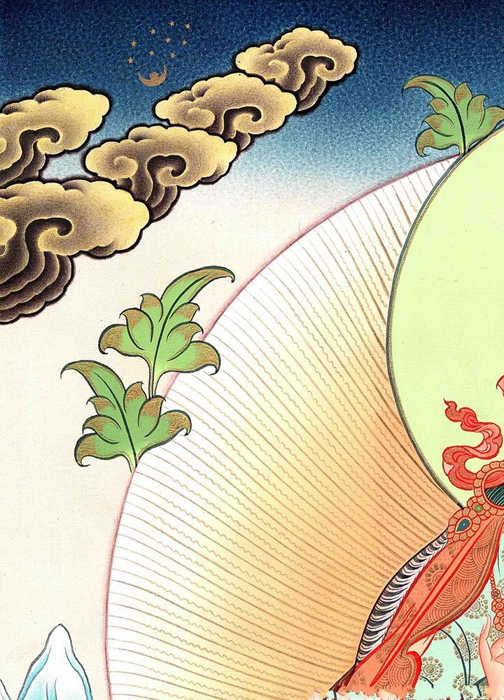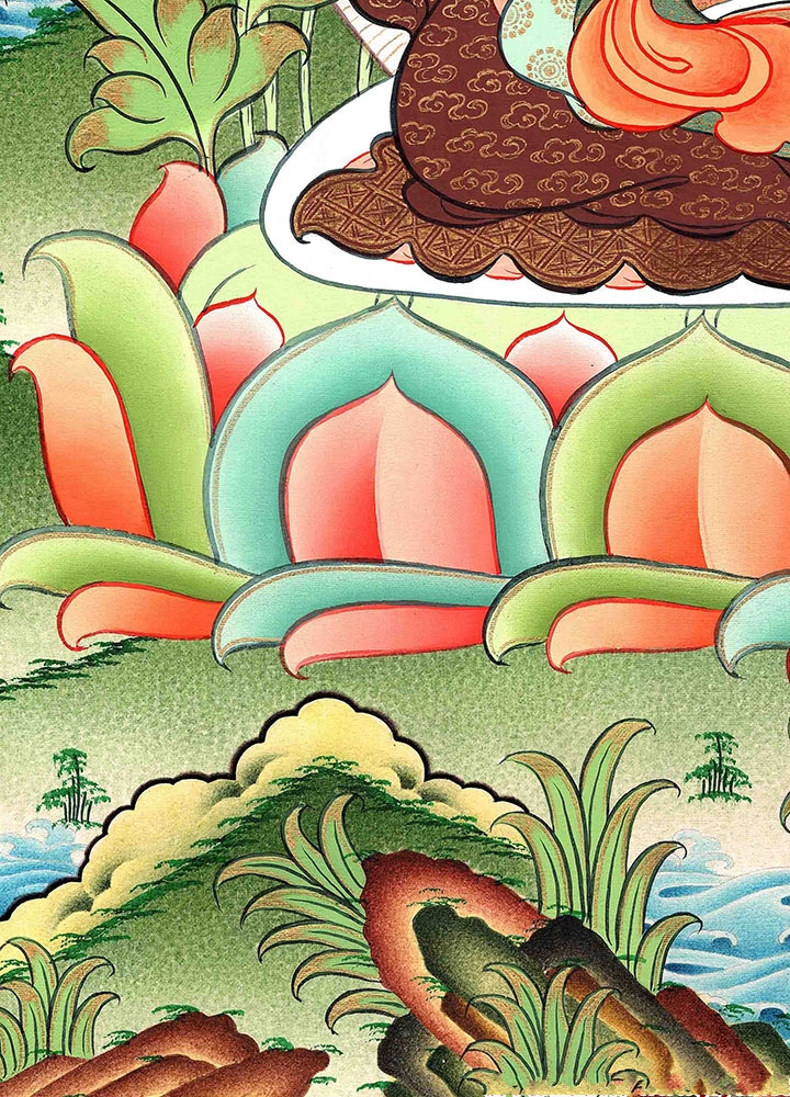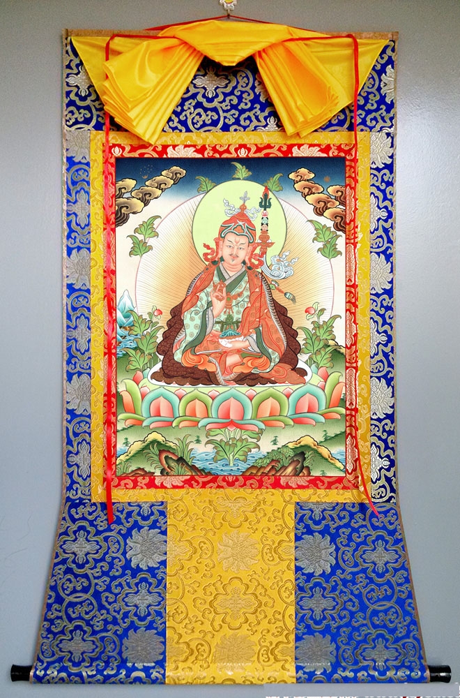 因是佛教圣相,所以我們選用的裝裱材料均是現在能有的最好的裝裱材料,正面選用定制的高檔棉織金絲錦緞很多仿制的是化纖材料,織繡藏傳佛教的富貴蓮花圖案,背面使用加厚仿真絲黃色綢緞布,手工精細裝裱而成,帶掛軸,照面,可直接懸掛到墻上。