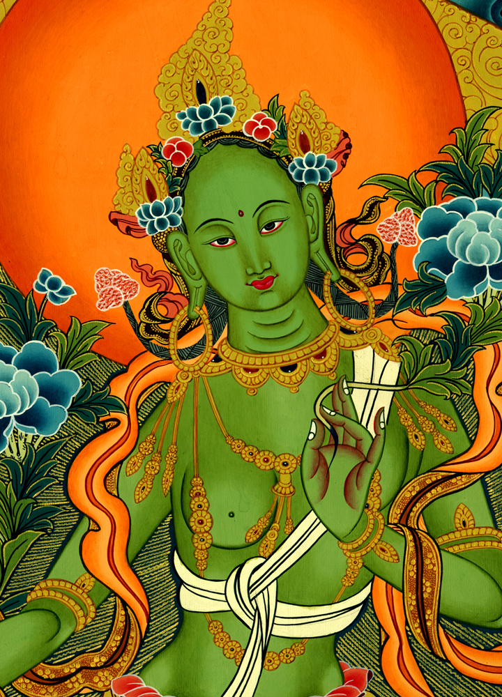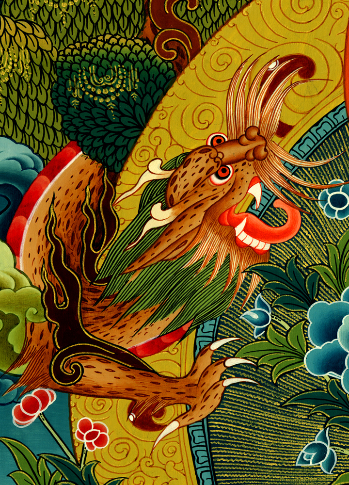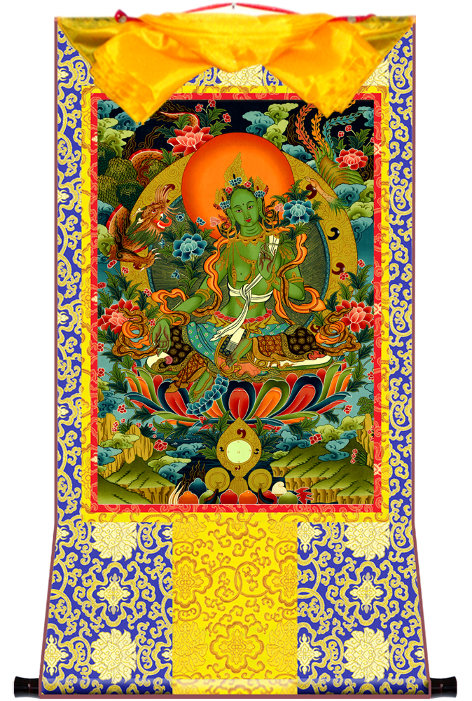 因是佛教圣相,所以我們選用的裝裱材料均是現在能有的最好的裝裱材料,正面選用定制的高檔棉織金絲錦緞很多仿制的是化纖材料,織繡藏傳佛教的富貴蓮花圖案,背面使用加厚仿真絲黃色綢緞布,手工精細裝裱而成,帶掛軸,照面,可直接懸掛到墻上。