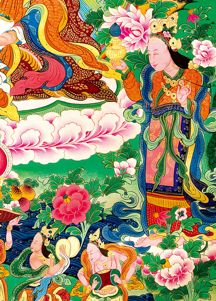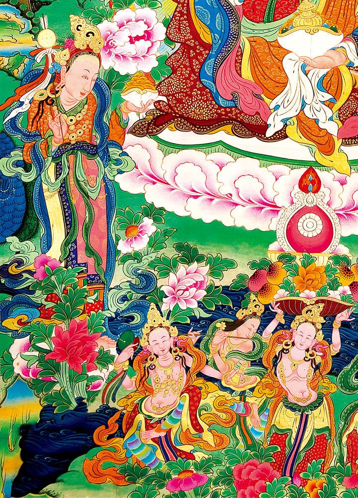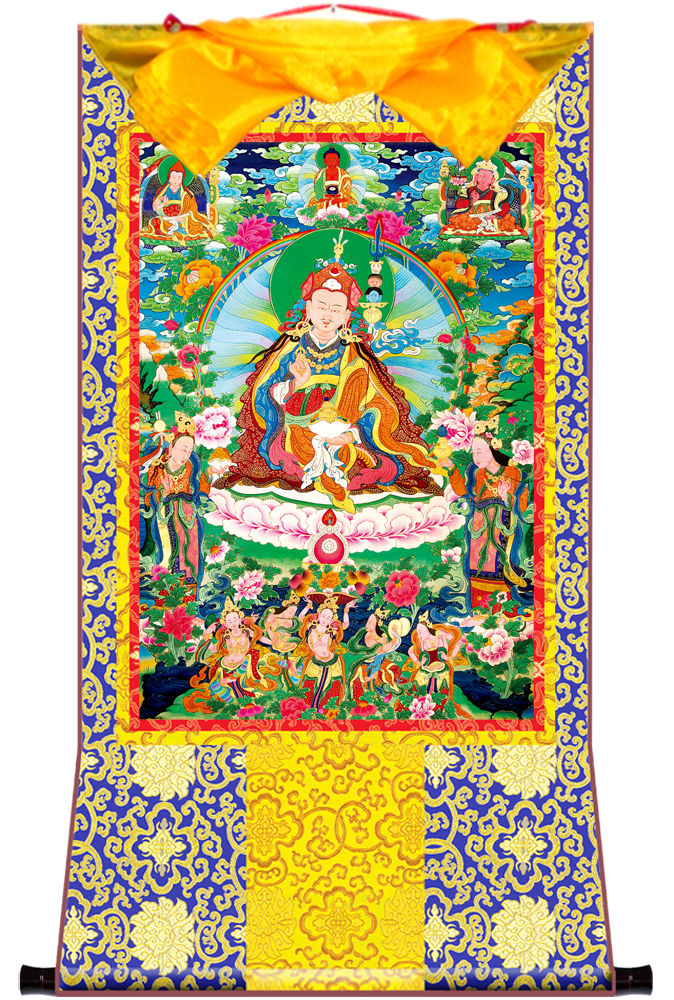 因是佛教圣相,所以我們選用的裝裱材料均是現在能有的最好的裝裱材料,正面選用定制的高檔棉織金絲錦緞很多仿制的是化纖材料,織繡藏傳佛教的富貴蓮花圖案,背面使用加厚仿真絲黃色綢緞布,手工精細裝裱而成,帶掛軸,照面,可直接懸掛到墻上。