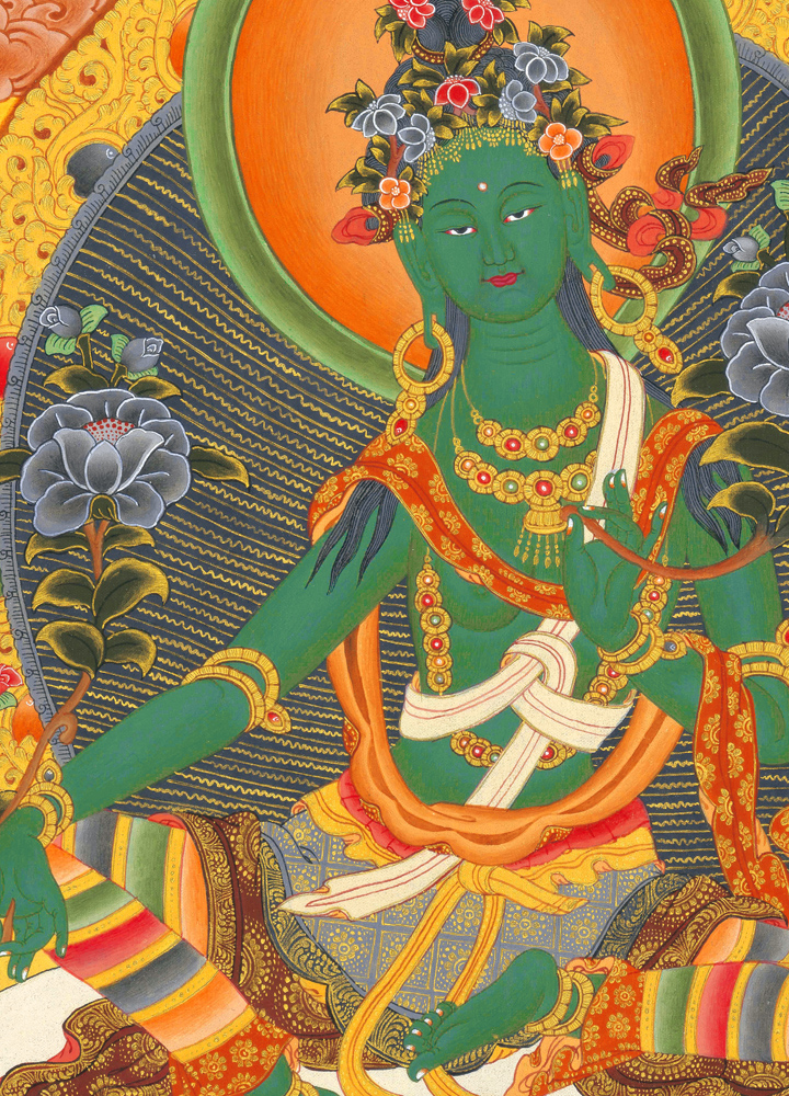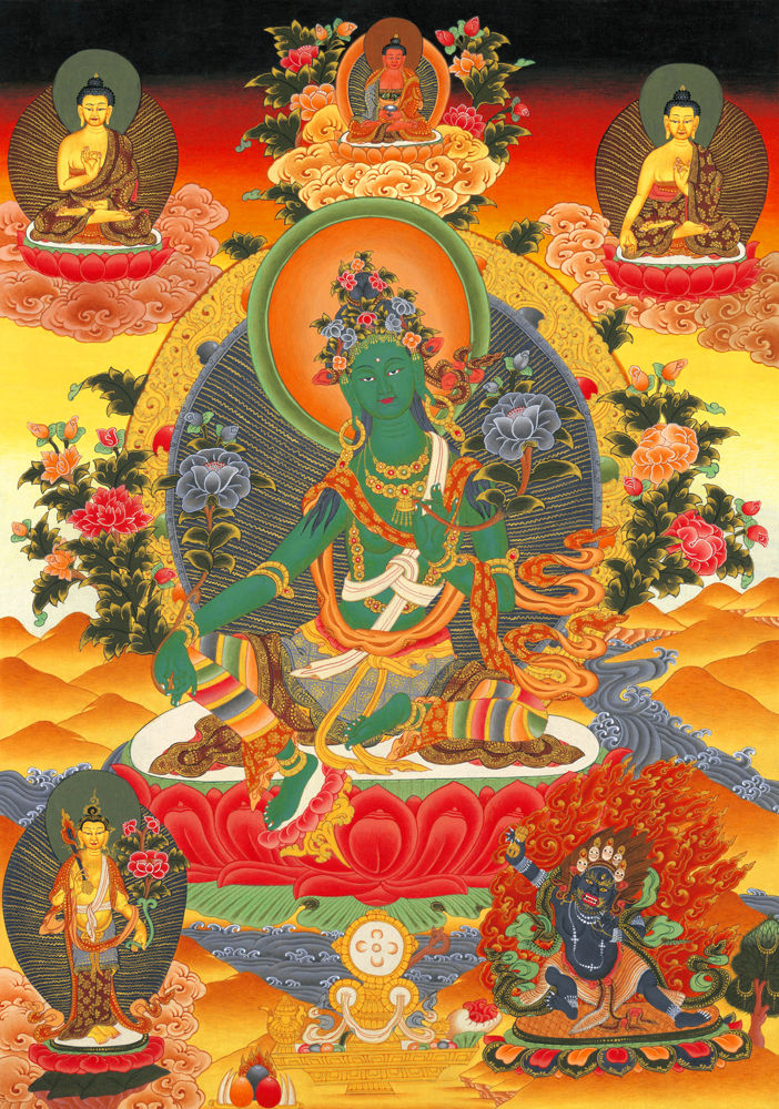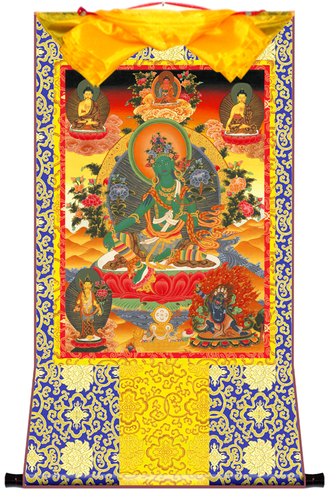 因是佛教圣相,所以我們選用的裝裱材料均是現在能有的最好的裝裱材料,正面選用定制的高檔棉織金絲錦緞很多仿制的是化纖材料,織繡藏傳佛教的富貴蓮花圖案,背面使用加厚仿真絲黃色綢緞布,手工精細裝裱而成,帶掛軸,照面,可直接懸掛到墻上。